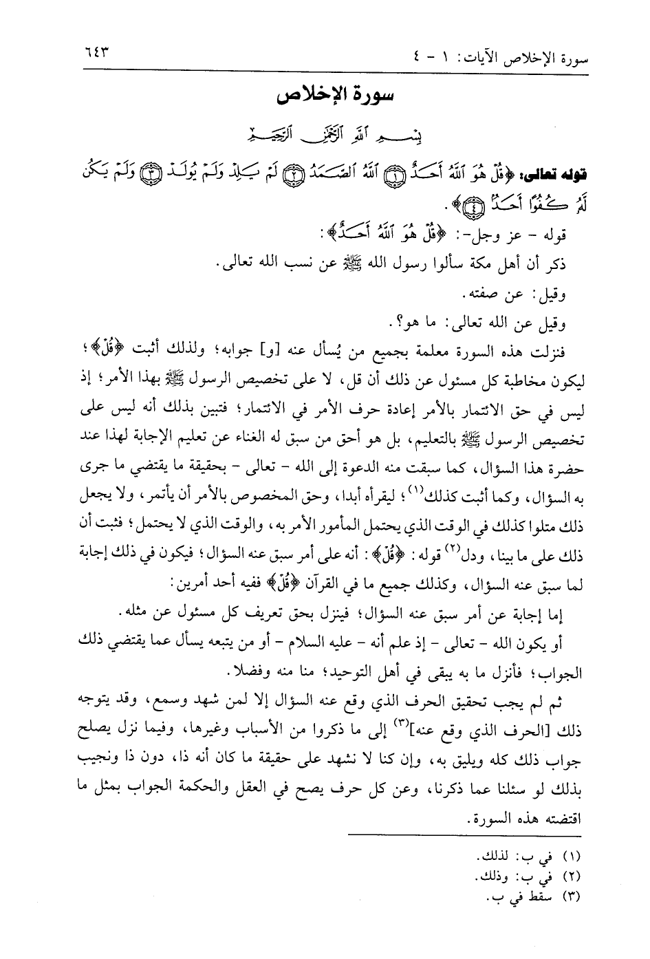 فنزلت هذه السورة معلمة بجميع من يُسأل عنه وجوابه؛ ولذلك أثبت (قُلْ)؛ ليكون مخاطبة كل مسئول عن ذلك أن قل، لا على تخصيص الرسول - صَلَّى اللَّهُ عَلَيهِ وَسَلَّمَ - بهذا الأمر؛ إذ ليس في حق الائتمار بالأمر إعادة حرف الأمر في الائتمار؛ فتبين بذلك أنه ليس على تخصيص الرسول - صَلَّى اللَّهُ عَلَيهِ وَسَلَّمَ - بالتعليم، بل هو أحق من سبق له الغناء عن تعليم الإجابة لهذا عند حضرة هذا السؤال، كما سبقت منه الدعوة إلى اللَّه - تعالى - بحقيقة ما يقتضي ما جرى به السؤال، وكما أثبت كذلك؛ ليقرأه أبدا، وحق المخصوص بالأمر أن يأتمر، ولا يجعل ذلك متلوا كذلك في الوقت الذي يحتمل المأمور الأمر به، والوقت الذي لا يحتمل؛ فثبت أن ذلك على ما بينا، ودل قوله: (قُلْ): أنه على أمر سبق عنه السؤال؛ فيكون في ذلك إجابة لما سبق عنه السؤال، وكذلك جميع ما في القرآن (قُلْ) ففيه أحد أمرين: