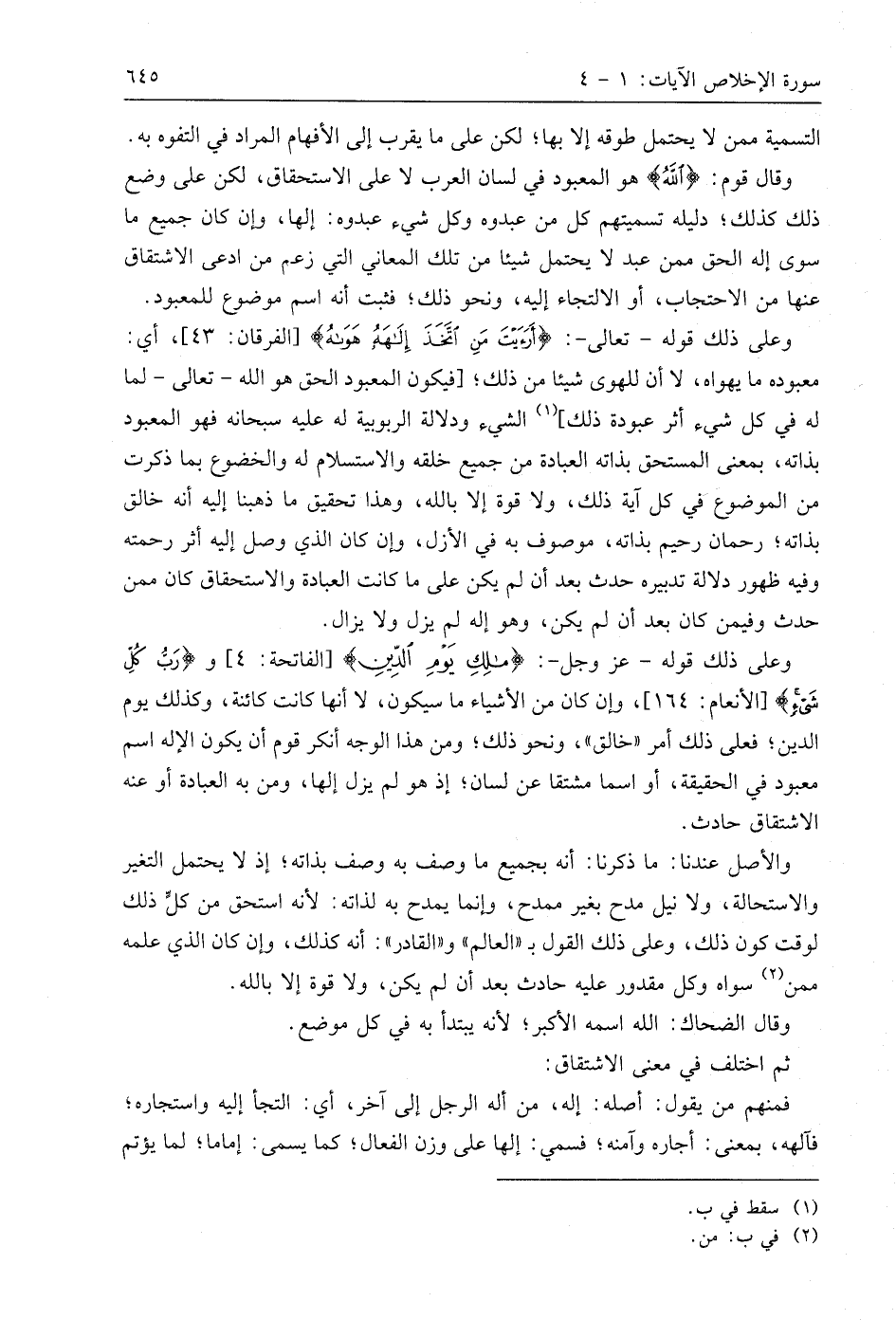 وعلى ذلك قوله - عَزَّ وَجَلَّ -: (مَالِكِ يَوْمِ الدِّينِ)، و (رَبُّ كُلِّ شَيْءٍ)، وإن كان من الأشياء ما سيكون، لا أنها كانت كائنة، وكذلك يوم الدِّين؛ فعلى ذلك أمر " خالق "، ونحو ذلك؛ ومن هذا الوجه أنكر قوم أن يكون الإله اسم معبود في الحقيقة، أو اسما مشتقا عن لسان؛ إذ هو لم يزل إلها، ومن به العبادة أو عنه الاشتقاق حادث.
