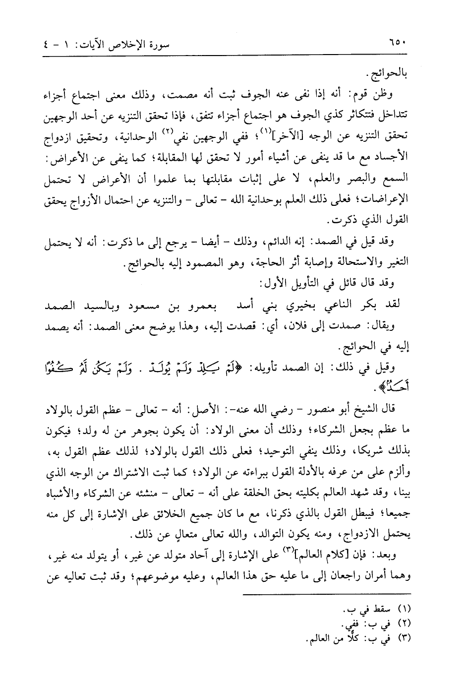 وظن قوم: أنه إذا نفى عنه الجوف ثبت أنه مصمت، وذلك معنى اجتماع أجزاء تتداخل فتتكاثر كذي الجوف هو اجتماع أجزاء تتفق، فإذا تحقق التنزيه عن أحد الوجهين تحقق التنزيه عن الوجه الآخر؛ ففي الوجهين نفي الوحدانية، وتحقيق ازدواج الأجساد مع ما قد ينفى عن أشياء أمور لا تحقق لها المقابلة؛ كما ينفى عن الأعراض: السمع والبصر والعلم، لا على إثبات مقابلتها بما علموا أن الأعراض لا تحتمل الإعراضات؛ فعلى ذلك العلم بوحدانية اللَّه - تعالى - والتنزيه عن احتمال الأزواج يحقق القول الذي ذكرت.