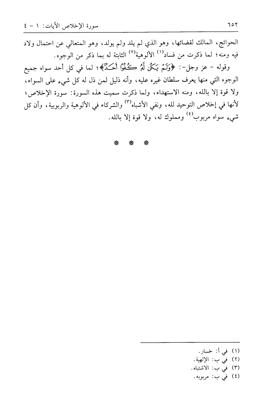 وقوله - عَزَّ وَجَلَّ -: (وَلَمْ يَكُنْ لَهُ كُفُوًا أَحَدٌ (4) لما في كل أحد سواه جميع الوجوه التي منها يعرف سلطان غيره عليه، وأنه ذليل لمن ذل له كل شيء على السواء، ولا قوة إلا باللَّه، ومنه الاستهداء، ولما ذكرت سميت هذه السورة: سورة الإخلاص؛ لأنها في إخلاص التوحيد لله، ونفي الأشباه والشركاء في الألوهية والربوبية، وأن كل شيء سواه مربوب ومملوك له، ولا قوة إلا باللَّه.
