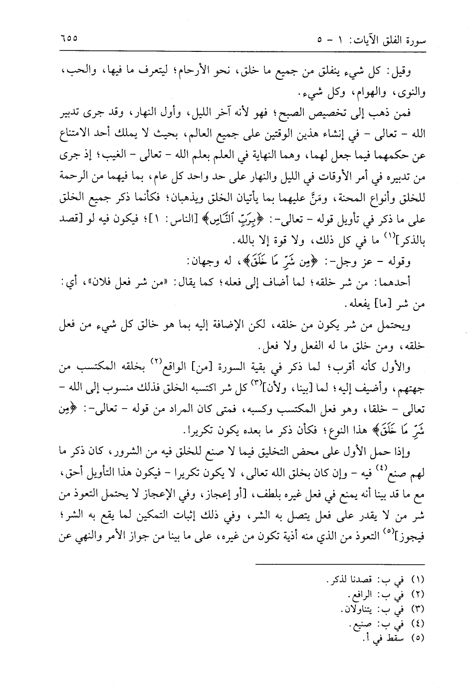 والأول كأنه أقرب؛ لما ذكر في بقية السورة من الواقع بخلقه المكتسب من جهتهم، وأضيف إليه؛ لما بينا، ولأن كل شر اكتسبه الخلق فذلك منسوب إلى اللَّه - تعالى - خلقا، وهو فعل المكتسب وكسبه، فمتى كان المراد من قوله - تعالى -: (مِنْ شَرِّ مَا خَلَقَ) هذا النوع؛ فكأن ذكر ما بعده يكون تكريرا.