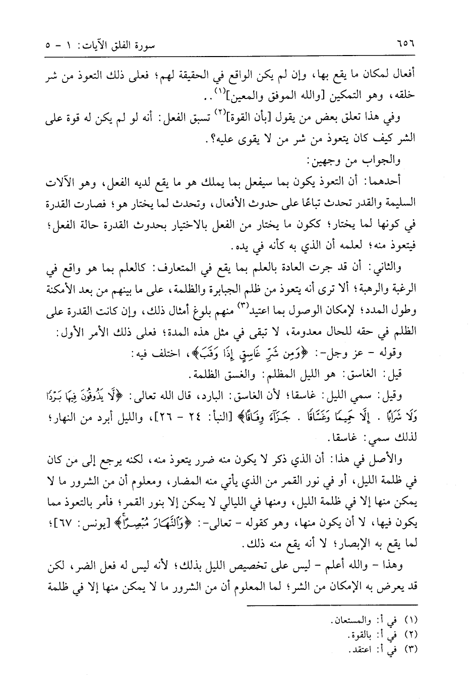 أحدهما: أن التعوذ يكون بما سيفعل بما يملك هو ما يقع لديه الفعل، وهو الآلات السليمة والقدر تحدث تباعًا على حدوث الأفعال، وتحدث لما يختار هو؛ فصارت القدرة في كونها لما يختار؛ ككون ما يختار من الفعل بالاختيار بحدوث القدرة حالة الفعل؛ فيتعوذ منه؛ لعلمه أن الذي به كأنه في يده.