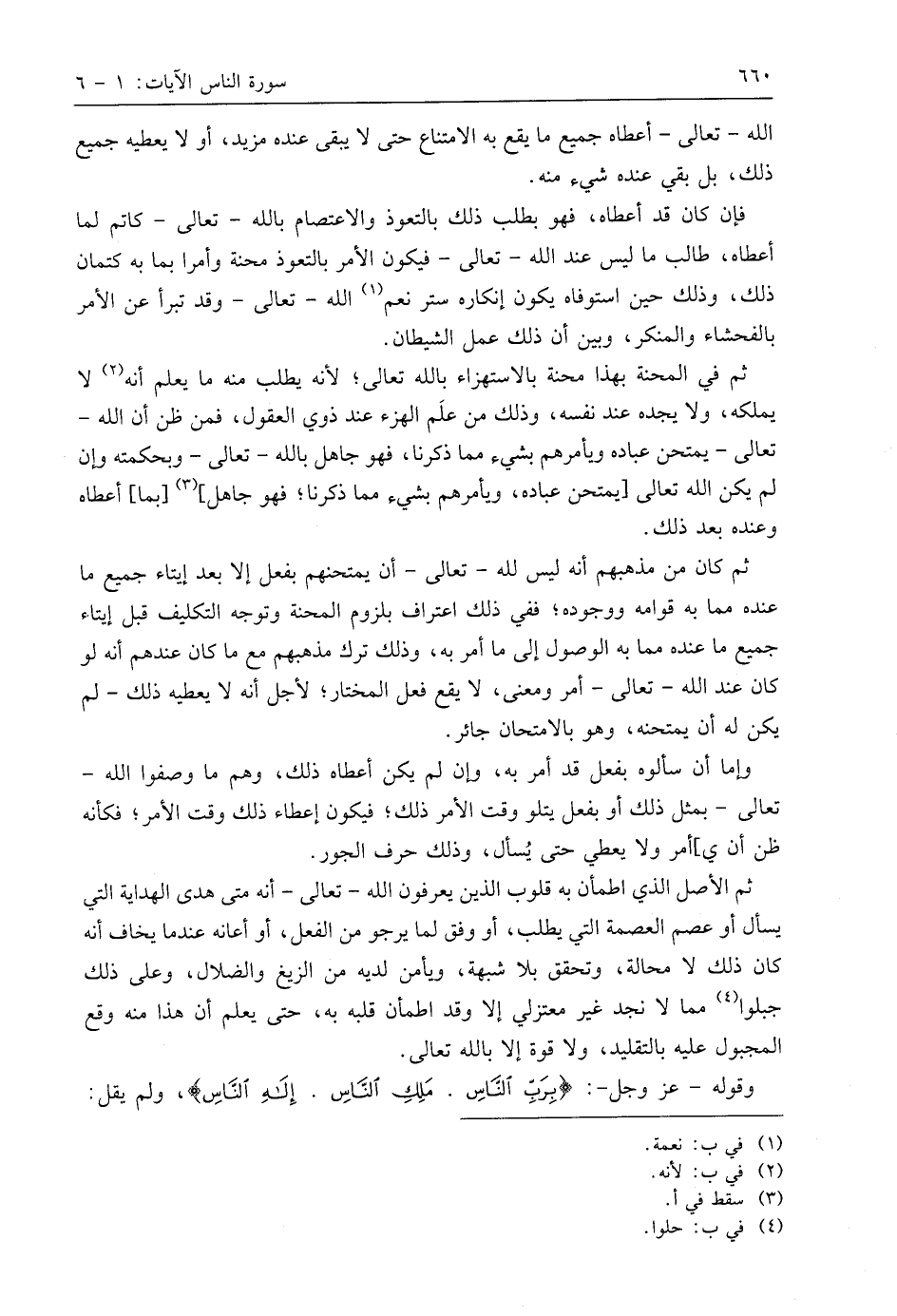 ثم في المحنة بهذا محنة بالاستهزاء باللَّه تعالى؛ لأنه يطلب منه ما يعلم أنه لا يملكه، ولا يجده عند نفسه، وذلك من علَم الهزء عند ذوي العقول، فمن ظن أن اللَّه - تعالى - يمتحن عباده ويأمرهم بشيء مما ذكرنا، فهو جاهل باللَّه - تعالى - وبحكمته وإن لم يكن اللَّه تعالى يمتحن عباده، ويأمرهم بشيء مما ذكرنا؛ فهو جاهل بما أعطاه وعنده بعد ذلك.