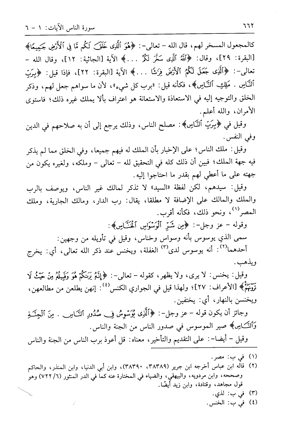 كالمجعول المسخر لهم، قال اللَّه - تعالى -: (هُوَ الَّذِي خَلَقَ لَكُمْ مَا فِي الْأَرْضِ جَمِيعًا)، وقال: (اللَّهُ الَّذِي سَخَّرَ لَكُم. . .) الآية، وقال اللَّه - تعالى -: (الَّذِي جَعَلَ لَكُمُ الْأَرْضَ فِرَاشًا. . .) الآية، فإذا قيل: (بِرَبِّ النَّاسِ (1) مَلِكِ النَّاسِ)، فكأنه قيل: " برب كل شيء "، لأن ما سواهم جعل لهم، وذكر الخلق والتوجيه إليه في الاستعاذة والاستعانة هو اعتراف بألا يملك غيره ذلك؛ فاستوى الأمران، واللَّه أعلم.