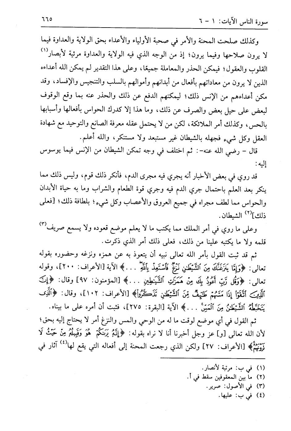 ثم قد ثبت القول بأمر اللَّه تعالى نبيه أن يتعوذ به عن همزه ونزغه وحضوره بقوله تعالى: (وَإِمَّا يَنْزَغَنَّكَ مِنَ الشَّيْطَانِ نَزْغٌ فَاسْتَعِذْ بِاللَّهِ. . .) الآية، وقوله تعالى: (وَقُلْ رَبِّ أَعُوذُ بِكَ مِنْ هَمَزَاتِ الشَّيَاطِينِ. . .)، وقال: (إِنَّ الَّذِينَ اتَّقَوْا إِذَا مَسَّهُمْ طَائِفٌ مِنَ الشَّيْطَانِ تَذَكَّرُوا)، وقال: (الَّذِي يَتَخَبَّطُهُ الشَّيْطَانُ مِنَ الْمَسِّ. . .) الآية، فثبت أن أمره على ما بيناه.