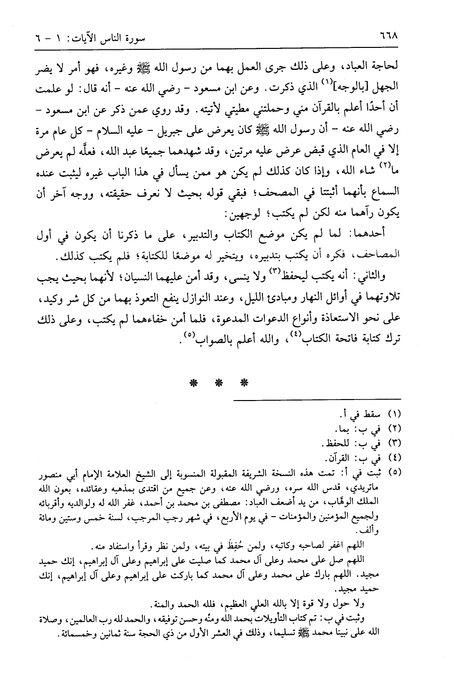 والثاني: أنه يكتب ليحفظ ولا ينسى، وقد أمن عليهما النسيان؛ لأنهما بحيث يجب تلاوتهما في أوائل النهار ومبادئ الليل، وعند النوازل ينفع التعوذ بهما من كل شر وكيد، على نحو الاستعاذة وأنواع الدعوات المدعوة، فلما أمن خفاءهما لم يكتب، وعلى ذلك ترك كتابة فاتحة الكتاب، واللَّه أعلم بالصواب.