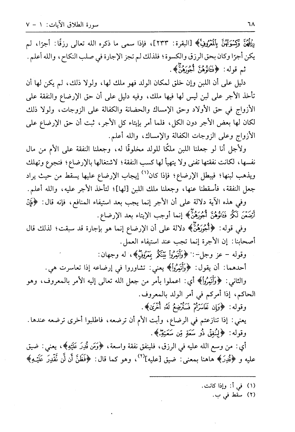 دليل على أن اللبن وإن خلق لمكان الولد فهو ملك لها، ولولا ذلك، لم يكن لها أن تأخذ الأجر على لبن ليس لها فيها ملك، وفيه دليل على أن حق الإرضاع والنفقة على الأزواج في حق الأولاد وحق الإمساك والحضانة والكفالة على الزوجات، ولولا ذلك لكان لها بعض الأجر دون الكل، فلما أمر بإيتاء كل الأجر، ثبت أن حق الإرضاع على الأزواج وعلى الزوجات الكفالة والإمساك، واللَّه أعلم.