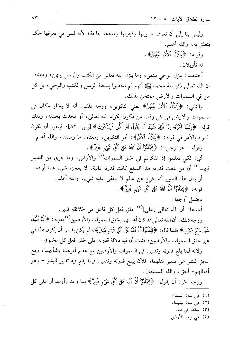 والثاني: (يَتَنَزَّلُ الْأَمْرُ بَيْنَهُنَّ) يعني التكوين، ووجه ذلك: أنه لا يخلو مكان في السماوات والأرض في كل وقت من مكون يكونه اللَّه تعالى، أو محدث يحدثه، وذلك قوله: (إِنَّمَا أَمْرُهُ إِذَا أَرَادَ شَيْئًا أَنْ يَقُولَ لَهُ كُنْ فَيَكُونُ)؛ فيجوز أن يكون المراد بالأمر في قوله: (يَتَنَزَّلُ الْأَمْرُ): أمر التكوين، ومعناه: ما وصفنا، واللَّه أعلم.