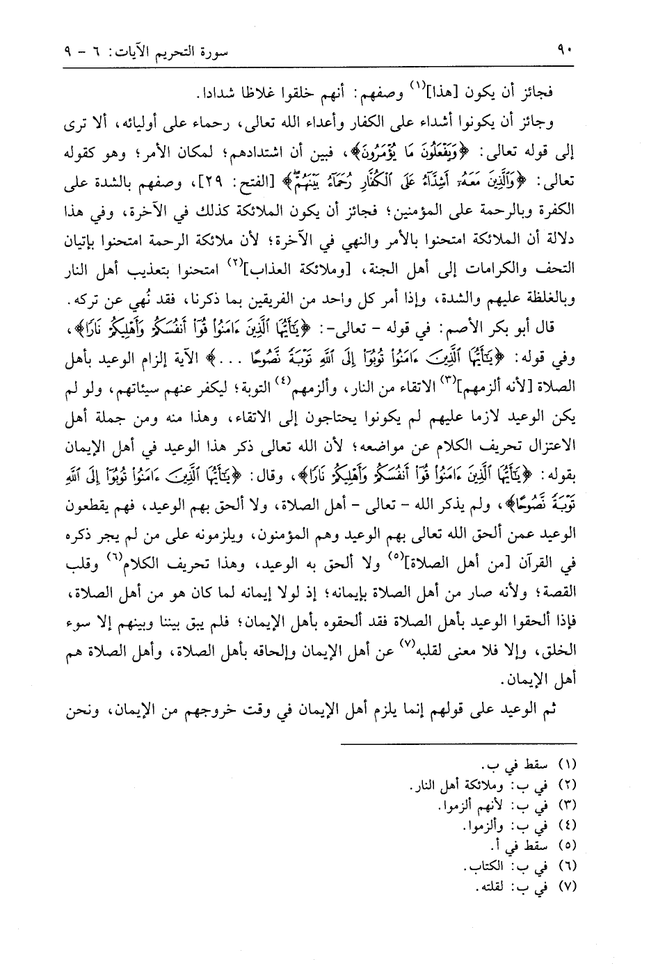 قال أبو بكر الأصم: في قوله - تعالى -: (يَا أَيُّهَا الَّذِينَ آمَنُوا قُوا أَنْفُسَكُمْ وَأَهْلِيكُمْ نَارًا)، وفي قوله: (يَا أَيُّهَا الَّذِينَ آمَنُوا تُوبُوا إِلَى اللَّهِ تَوْبَةً نَصُوحًا. . .) الآية إلزام الوعيد بأهل الصلاة لأنه ألزمهم الاتقاء من النار، وألزمهم التوبة؛ ليكفر عنهم سيئاتهم، ولو لم يكن الوعيد لازما عليهم لم يكونوا يحتاجون إلى الاتقاء، وهذا منه ومن جملة أهل الاعتزال تحريف الكلام عن مواضعه؛ لأن اللَّه تعالى ذكر هذا الوعيد في أهل الإيمان بقوله: (يَا أَيُّهَا الَّذِينَ آمَنُوا قُوا أَنْفُسَكُمْ وَأَهْلِيكُمْ نَارًا)، وقال: (يَا أَيُّهَا الَّذِينَ آمَنُوا تُوبُوا إِلَى اللَّهِ تَوْبَةً نَصُوحًا)، ولم يذكر اللَّه - تعالى - أهل الصلاة، ولا ألحق بهم الوعيد، فهم يقطعون الوعيد عمن ألحق اللَّه تعالى بهم الوعيد وهم المؤمنون، ويلزمونه على من لم يجر ذكره في القرآن من أهل الصلاة ولا ألحق به الوعيد، وهذا تحريف الكلام وقلب القصة؛ ولأنه صار من أهل الصلاة بإيمانه؛ إذ لولا إيمانه لما كان هو من أهل الصلاة، فإذا ألحقوا الوعيد بأهل الصلاة فقد ألحقوه بأهل الإيمان؛ فلم يبق بيننا وبينهم إلا سوء الخلق، وإلا فلا معنى لقلبه عن أهل الإيمان وإلحاقه بأهل الصلاة، وأهل الصلاة هم أهل الإيمان.