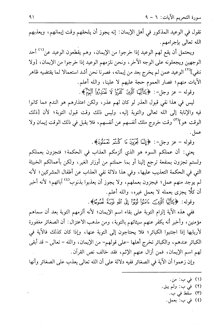 نقول في الوعيد المذكور في أهل الإيمان: إنه يجوز أن يلحقهم وقت إيمانهم، ويعذبهم اللَّه تعالى بإجرامهم.