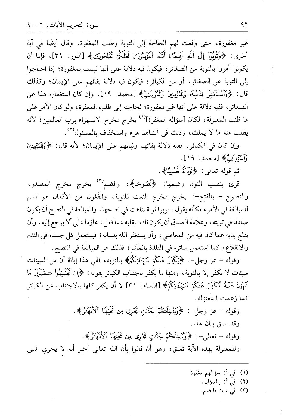 غير مغفورة، حتى وقعت لهم الحاجة إلى التوبة وطلب المغفرة، وقال أيضًا في آية أخرى: (وَتُوبُوا إِلَى اللَّهِ جَمِيعًا أَيُّهَ الْمُؤْمِنُونَ لَعَلَّكُمْ تُفْلِحُونَ)، فإما أن يكونوا أمروا بالتوبة عن الصغائر؛ فيكون فيه دلالة على أنها ليست بمغفورة؛ إذا احتاجوا إلى التوبة عن الصغائر، أو عن الكبائر؛ فيكون فيه دلالة بقائهم على الإيمان! وكذلك قال: (وَاسْتَغْفِرْ لِذَنْبِكَ وَلِلْمُؤْمِنِينَ وَالْمُؤْمِنَاتِ)، وإن كان استغفاره هذا عن الصغائر، ففيه دلالة على أنها غير مغفورة؛ لحاجته إلى طلب المغفرة، ولو كان الأمر على ما ظنت المعتزلة، لكان سؤاله المغفرة يخرج مخرج الاستهزاء برب العالمين؛ لأنه يطلب منه ما لا يملك، وذلك في الشاهد هزء واستخفاف بالمسئول.