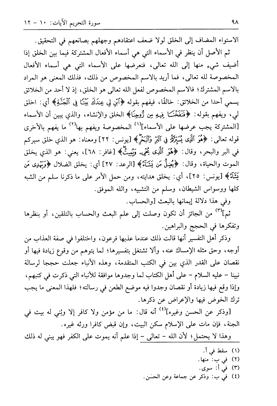 ثم الأصل أن ينظر في الأسماء التي هي أسماء الأفعال المشتركة فيما بين الخلق إذا أضيف شيء منها إلى اللَّه تعالى، فنعرضها على الأسماء التي هي أسماء الأفعال المخصوصة لله تعالى، فما أريد بالاسم المخصوص من ذلك، فذلك المعنى هو المراد بالاسم المشترك؛ فالاسم المخصوص لفعل اللَّه تعالى هو الخلق، إذ لا أحد من الخلائق يسمي أحدا من الخلائق: خالقًا، فيفهم بقوله (ابْنِ لِي عِنْدَكَ بَيْتًا فِي الْجَنَّةِ) أي: اخلق لي، ويفهم بقوله: (فَنَفَخْنَا فِيهِ مِنْ رُوحِنَا) الخلق والإنشاء، والذي يبين أن الأسماء المشتركة يجب عرضها على الأسماء المخصوصة ويفهم بها ما يفهم بالأخرى قوله تعالى: (هُوَ الَّذِي يُسَيِّرُكُمْ فِي الْبَرِّ وَالْبَحْرِ)، ومعناه: هو الذي خلق سيركم في البر والبحر، وقال: (هُوَ الَّذِي يُحْيِي وَيُمِيتُ)، يعني: هو الذي يخلق الموت والحياة، وقال: (يُضِلُّ مَن يَشَآءُ)، أي: يخلق الضلال (وَيَهْدِي مَنْ يَشَاءُ)، أي: يخلق هدايته، ومن حمل الأمر على ما ذكرنا سلم من الشبه كلها ووسواس الشيطان، وسلم من التشبيه، واللَّه الموفق.