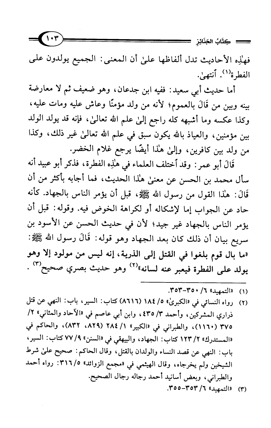 قَالَ أبو عمر: وقد اختلف العلماء في هذِه الفطرة، فذكر أبو عبيد أنه سأل محمد بن الحسن عن معنى هذا الحديث، فما أجابه بأكثر من أن قَالَ: هذا القول من رسول الله - صلى الله عليه وسلم -، قبل أن يؤمر الناس بالجهاد. كأنه حاد عن الجواب إما لإشكاله أو لكراهة الخوض فيه. وقوله: قبل أن يؤمر الناس بالجهاد غير جيد؛ لأن في حديث الحسن عن الأسود بن سريع بيان أن ذلك كان بعد الجهاد وهو قوله: قَالَ رسول الله - صلى الله عليه وسلم -: "ما بال قوم بلغوا في القتل إلى الذرية، إنه ليس من مولود إلا وهو يولد على الفطرة فيعبر عنه لسانه" (¬2) وهو حديث بصري صحيح (¬3).
