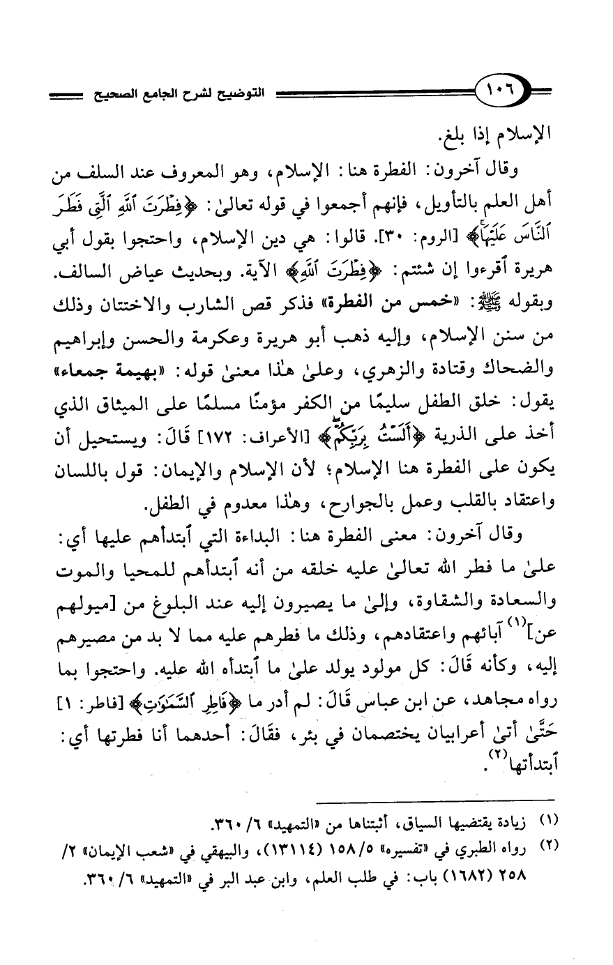 وقال آخرون: الفطرة هنا: الإسلام، وهو المعروف عند السلف من أهل العلم بالتأويل، فإنهم أجمعوا في قوله تعالى: {فِطْرَتَ اللهِ الَّتِي فَطَرَ النَّاسَ عَلَيْهَا} [الروم: 30]. قالوا: هي دين الإسلام، واحتجوا بقول أبي هريرة اقرءوا إن شئتم: {فِطْرَتَ اللهِ} الآية. وبحديث عياض السالف. وبقوله - صلى الله عليه وسلم -: "خمس من الفطرة" فذكر قص الشارب والاختتان وذلك من سنن الإسلام، وإليه ذهب أبو هريرة وعكرمة والحسن وإبراهيم والضحاك وقتادة والزهري، وعلى هذا معنى قوله: "بهيمة جمعاء" يقول: خلق الطفل سليمًا من الكفر مؤمنًا مسلمًا على الميثاق الذي أخذ على الذرية {أَلَسْتُ بِرَبِّكُمْ} [الأعراف: 172] قَالَ: ويستحيل أن يكون على الفطرة هنا الإسلام؛ لأن الإسلام والإيمان: قول باللسان واعتقاد بالقلب وعمل بالجوارح، وهذا معدوم في الطفل.