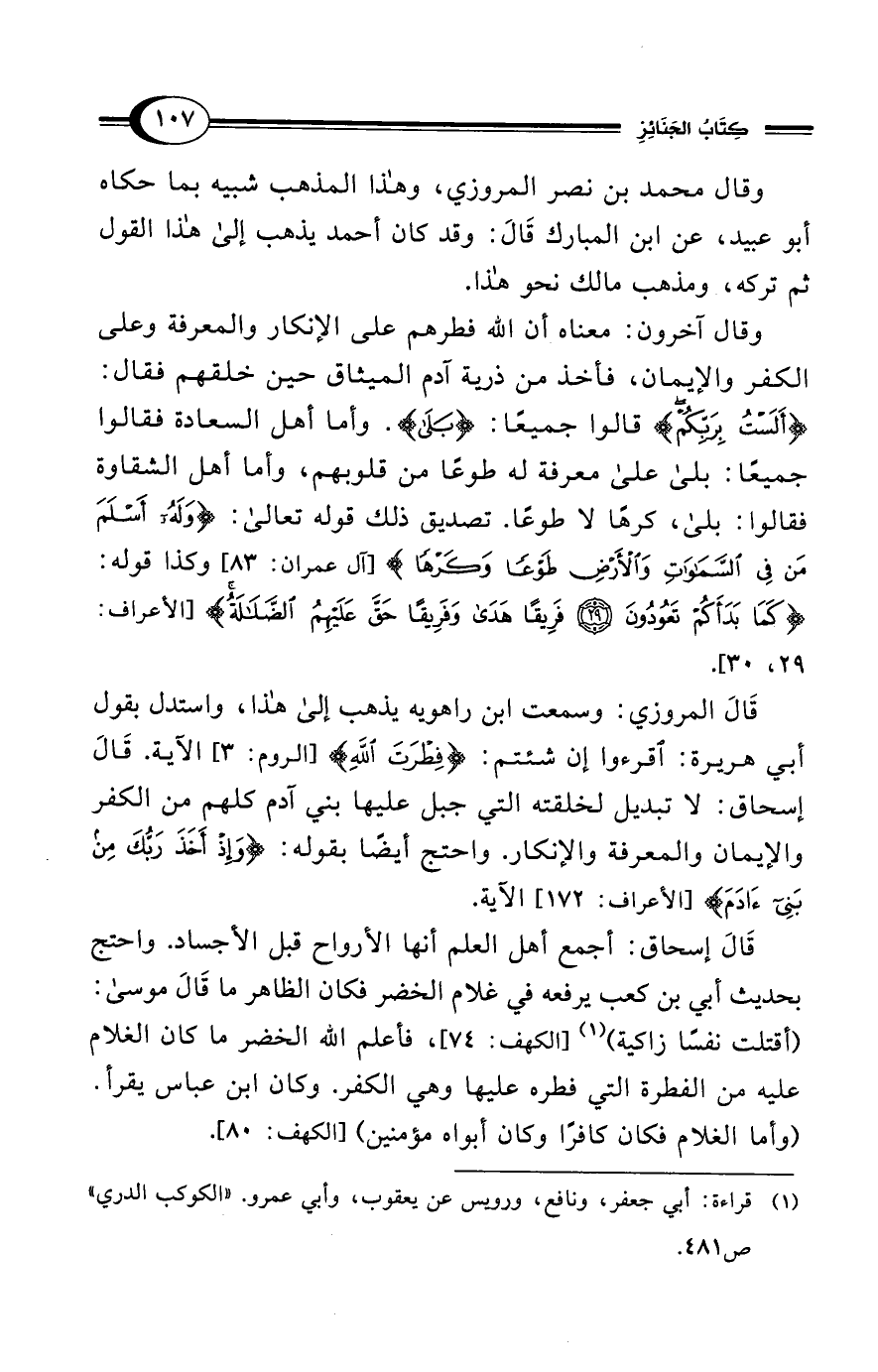 قَالَ إسحاق: أجمع أهل العلم أنها الأرواح قبل الأجساد. واحتج بحديث أبي بن كعب يرفعه في غلام الخضر فكان الظاهر ما قَالَ موسى: (أقتلت نفسًا زاكية) (¬1) [الكهف: 74]، فأعلم الله الخضر ما كان الغلام عليه من الفطرة التي فطره عليها وهي الكفر. وكان ابن عباس يقرأ. (وأما الغلام فكان كافرًا وكان أبواه مؤمنين) [الكهف: 80].