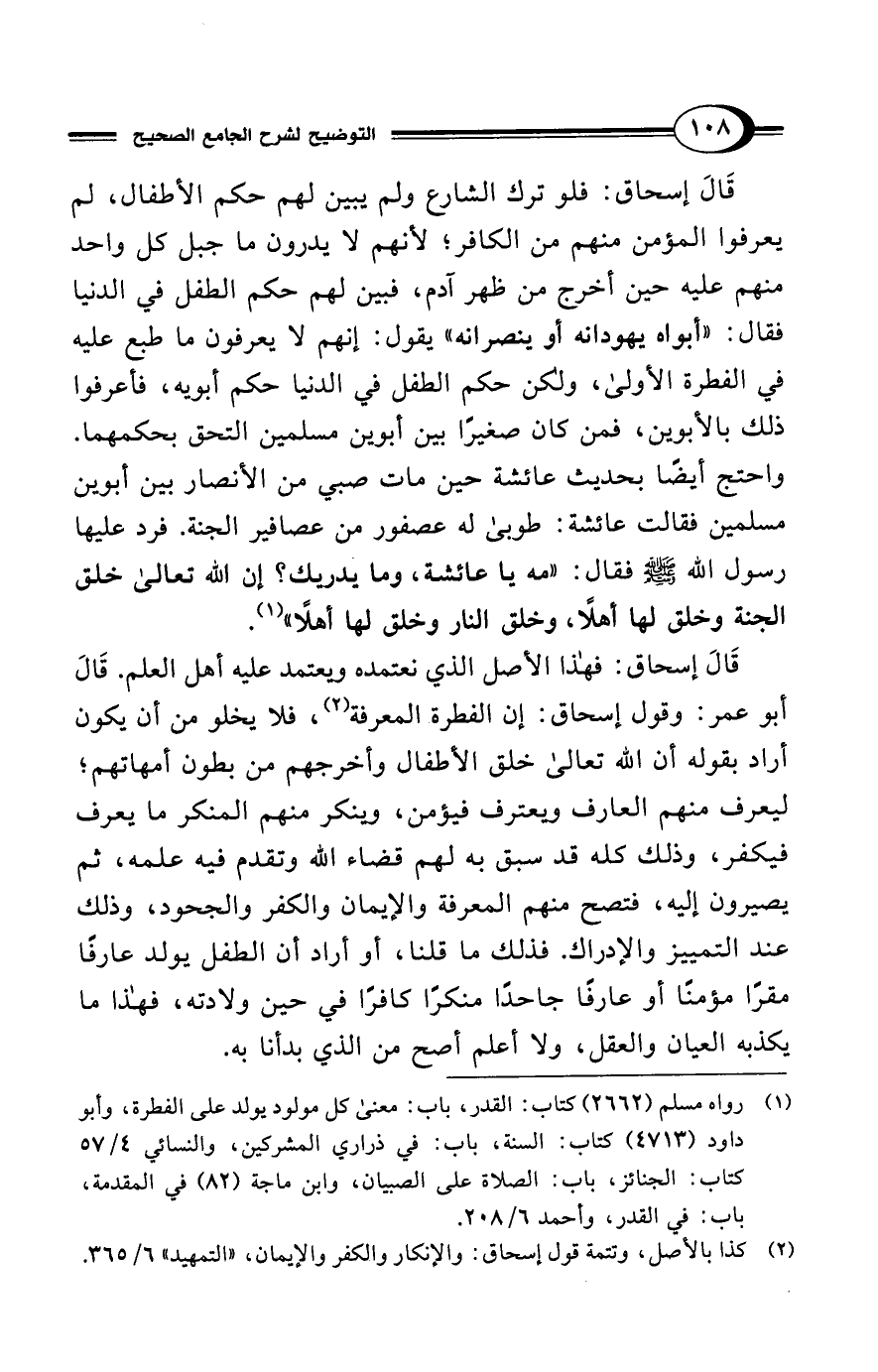 قَالَ إسحاق: فلو ترك الشارع ولم يبين لهم حكم الأطفال، لم يعرفوا المؤمن منهم من الكافر؛ لأنهم لا يدرون ما جبل كل واحد منهم عليه حين أخرج من ظهر آدم، فبين لهم حكم الطفل في الدنيا فقال: "أبواه يهودانه أو ينصرانه" يقول: إنهم لا يعرفون ما طبع عليه في الفطرة الأولى، ولكن حكم الطفل في الدنيا حكم أبويه، فأعرفوا ذلك بالأبوين، فمن كان صغيرًا بين أبوين مسلمين التحق بحكمهما.