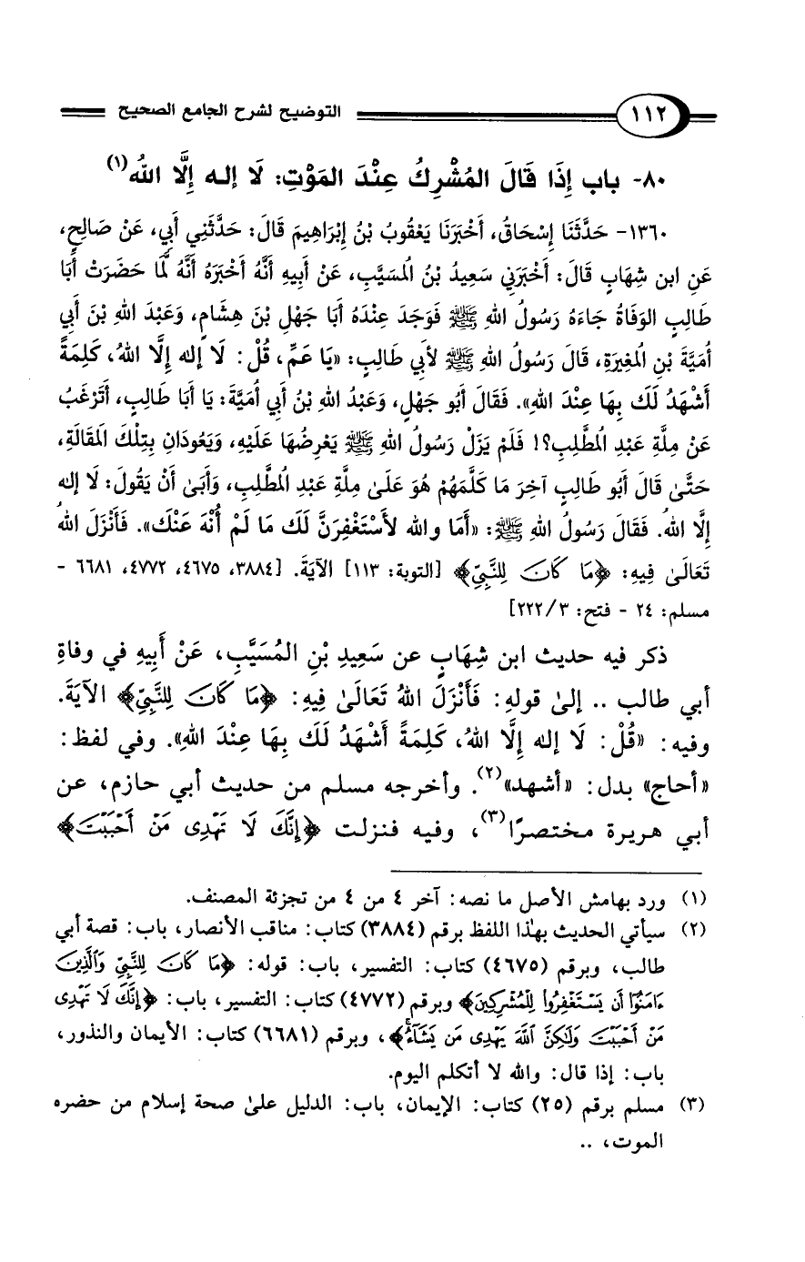 80 - باب إِذَا قَالَ المُشْرِكُ عِنْدَ المَوْتِ: لاَ إِلَهَ إِلاَّ اللهُ (¬1)