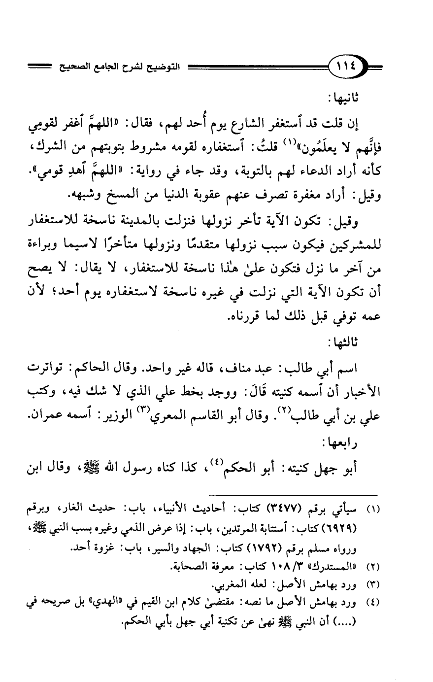إن قلت قد استغفر الشارع يوم أُحد لهم، فقال: "اللهمَّ اغفر لقومِي فإنَّهم لا يعلَمُون" (¬1) قلتُ: استغفاره لقومه مشروط بتوبتهم من الشرك، كأنه أراد الدعاء لهم بالتوبة، وقد جاء في رواية: "اللهمَّ اهدِ قومي".