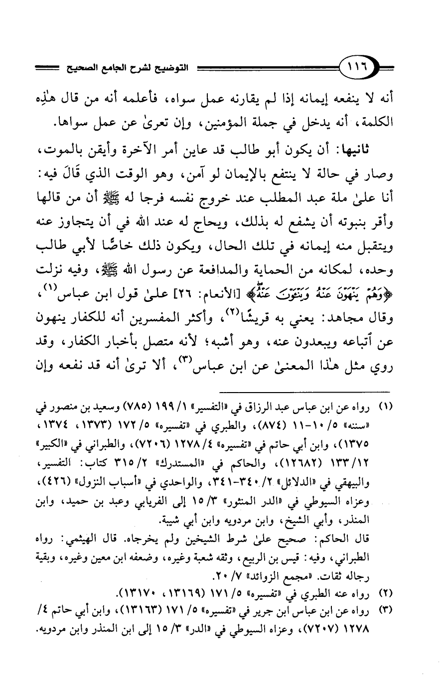 ثانيها: أن يكون أبو طالب قد عاين أمر الآخرة وأيقن بالموت، وصار في حالة لا ينتفع بالإيمان لو آمن، وهو الوقت الذي قَالَ فيه: أنا على ملة عبد المطلب عند خروج نفسه فرجا له - صلى الله عليه وسلم - أن من قالها وأقر بنبوته أن يشفع له بذلك، ويحاج له عند الله في أن يتجاوز عنه ويتقبل منه إيمانه في تلك الحال، ويكون ذلك خاصًّا لأبي طالب وحده، لمكانه من الحماية والمدافعة عن رسول الله - صلى الله عليه وسلم -، وفيه نزلت {وَهُمْ يَنْهَوْنَ عَنْهُ وَيَنْأَوْنَ عَنْهُ} [الأنعام: 26] على قول ابن عباس (¬1)، وقال مجاهد: يعني به قريشًا (¬2)، وأكثر المفسرين أنه للكفار ينهون عن اتباعه ويبعدون عنه، وهو أشبه؛ لأنه متصل بأخبار الكفار، وقد روي مثل هذا المعنى عن ابن عباس (¬3)، ألا ترى أنه قد نفعه وإن