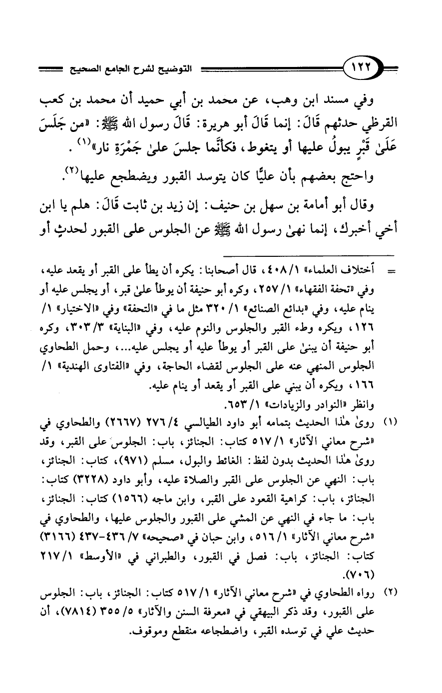 واحتج بعضهم بأن عليًّا كان يتوسد القبور ويضطجع عليها (¬2).