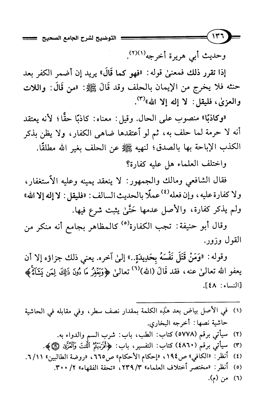 إذا تقرر ذلك على قوله: "فهو كما قَالَ" يريد إن أضمر الكفر بعد حنثه فلا يخرج من الإيمان بالحلف وقد قَالَ - صلى الله عليه وسلم -: "من قَالَ: واللات والعزى، فليقل: لا إله إلا الله" (¬3).