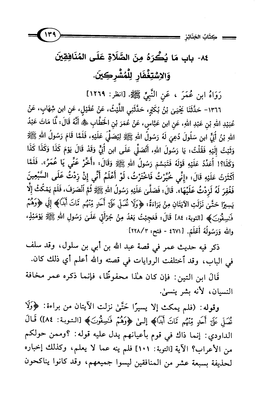 1366 - حَدَّثَنَا يَحْيَى بْنُ بُكَيْرٍ، حَدَّثَنِي اللَّيْثُ، عَنْ عُقَيْلٍ، عَنِ ابْنِ شِهَابٍ، عَنْ عُبَيْدِ اللهِ بْنِ عَبْدِ اللهِ، عَنِ ابْنِ عَبَّاسٍ، عَنْ عُمَرَ بْنِ الخَطَّابِ - رضي الله عنهم - أَنَّهُ قَالَ: لَمَّا مَاتَ عَبْدُ اللهِ بْنُ أُبَيٍّ ابْنُ سَلُولَ دُعِيَ لَهُ رَسُولُ اللهِ - صلى الله عليه وسلم - لِيُصَلِّيَ عَلَيْهِ، فَلَمَّا قَامَ رَسُولُ اللهِ - صلى الله عليه وسلم - وَثَبْتُ إِلَيْهِ فَقُلْتُ: يَا رَسُولَ اللهِ، أَتُصَلِّي عَلَى ابْنِ أُبَيٍّ وَقَدْ قَالَ يَوْمَ كَذَا وَكَذَا كَذَا وَكَذَا؟! أُعَدِّدُ عَلَيْهِ قَوْلَهُ فَتَبَسَّمَ رَسُولُ اللهِ - صلى الله عليه وسلم - وَقَالَ: "أَخِّرْ عَنِّي يَا عُمَرُ". فَلَمَّا أَكْثَرْتُ عَلَيْهِ قَالَ: "إِنِّي خُيِّرْتُ فَاخْتَرْتُ، لَوْ أَعْلَمُ أَنِّي إِنْ زِدْتُ عَلَى السَّبْعِينَ فَغُفِرَ لَهُ لَزِدْتُ عَلَيْهَا". قَالَ: فَصَلَّى عَلَيْهِ رَسُولُ اللهِ - صلى الله عليه وسلم - ثُمَّ انْصَرَفَ، فَلَمْ يَمْكُثْ إِلاَّ يَسِيرًا حَتَّى نَزَلَتِ الآيَتَانِ مِنْ بَرَاءَةٌ: {وَلَا تُصَلِّ عَلَى أَحَدٍ مِنْهُمْ مَاتَ أَبَدًا} إِلَى {وَهُمْ فَاسِقُونَ} [التوبة: 84] قَالَ: فَعَجِبْتُ بَعْدُ مِنْ جُرْأَتِي عَلَى رَسُولِ اللهِ - صلى الله عليه وسلم - يَوْمَئِذٍ، وَاللهُ وَرَسُولُهُ أَعْلَمُ. [4671 - فتح: 3/ 228]