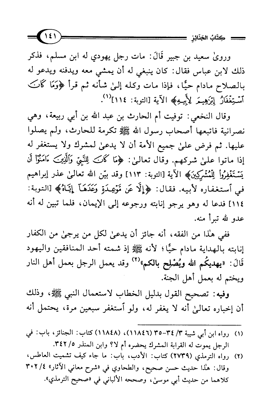 وروى سعيد بن جبير قَالَ: مات رجل يهودي له ابن مسلم، فذكر ذلك لابن عباس فقال: كان ينبغي له أن يمشي معه ويدفنه ويدعو له بالصلاح مادام حيًّا، فإذا مات وكله إلى شأنه ثم قرأ {وَمَا كَانَ اسْتِغْفَارُ إِبْرَاهِيمَ لِأَبِيهِ} الآية [التوبة: 114] (¬1).