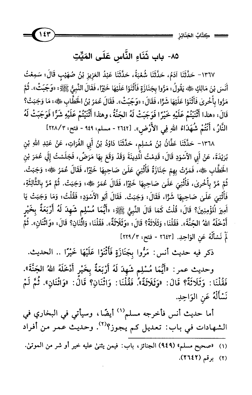 1368 - حَدَّثَنَا عَفَّانُ بْنُ مُسْلِمٍ، حَدَّثَنَا دَاوُدُ بْنُ أَبِي الفُرَاتِ، عَنْ عَبْدِ اللهِ بْنِ بُرَيْدَةَ عَنْ أَبِي الأَسْوَدِ قَالَ: قَدِمْتُ المَدِينَةَ وَقَدْ وَقَعَ بِهَا مَرَضٌ، فَجَلَسْتُ إِلَي عُمَرَ بْنِ الخَطَّابِ - رضي الله عنه -، فَمَرَّتْ بِهِمْ جَنَازَةٌ فَأُثْنِيَ عَلَى صَاحِبِهَا خَيْرًا، فَقَالَ عُمَرُ - رضى الله عنه -: وَجَبَتْ. ثُمَّ مُرَّ بِأُخْرَى، فَأُثْنِيَ عَلَى صَاحِبِهَا خَيْرًا، فَقَالَ عُمَرُ - رضي الله عنه -: وَجَبَتْ. ثُمَّ مُرَّ بِالثَّالِثَةِ، فَأُثْنِيَ عَلَى صَاحِبِهَا شَرًّا فَقَالَ: وَجَبَتْ. فَقَالَ أَبُو الأَسْوَدِ: فَقُلْتُ: وَمَا وَجَبَتْ يَا أَمِيرَ المُؤْمِنِينَ؟ قَالَ: قُلْتُ كَمَا قَالَ النَّبِيُّ - صلى الله عليه وسلم -: "أَيُّمَا مُسْلِمٍ شَهِدَ لَهُ أَرْبَعَةٌ بِخَيْرٍ أَدْخَلَهُ اللهُ الجَنَّةَ". فَقُلْنَا: وَثَلاَثَةٌ؟ قَالَ: "وَثَلاَثَةٌ". فَقُلْنَا: وَاثْنَانِ؟ قَالَ: "وَاثْنَانِ". ثُمَّ لَمْ نَسْأَلْهُ عَنِ الوَاحِدِ. [2643 - فتح: 3/ 229]