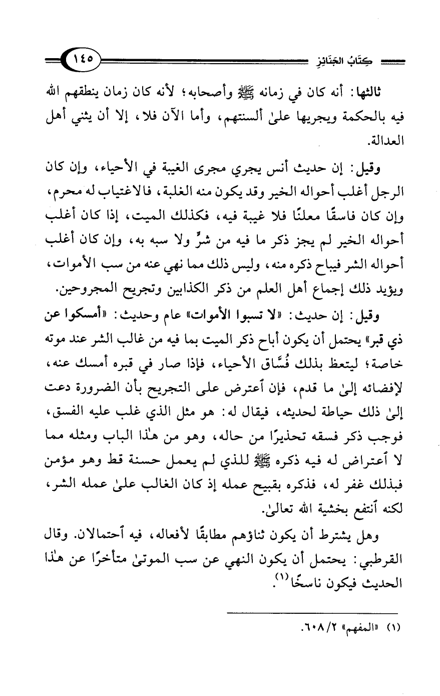 الرجل أغلب أحواله الخير وقد يكون منه الغلبة، فالاغتياب له محرم، وإن كان فاسقًا معلنًا فلا غيبة فيه، فكذلك الميت، إذا كان أغلب أحواله الخير لم يجز ذكر ما فيه من شرٍّ ولا سبه به، وإن كان أغلب أحواله الشر فيباح ذكره منه، وليس ذلك مما نهي عنه من سب الأموات، ويؤيد ذلك إجماع أهل العلم من ذكر الكذابين وتجريح المجروحين.
