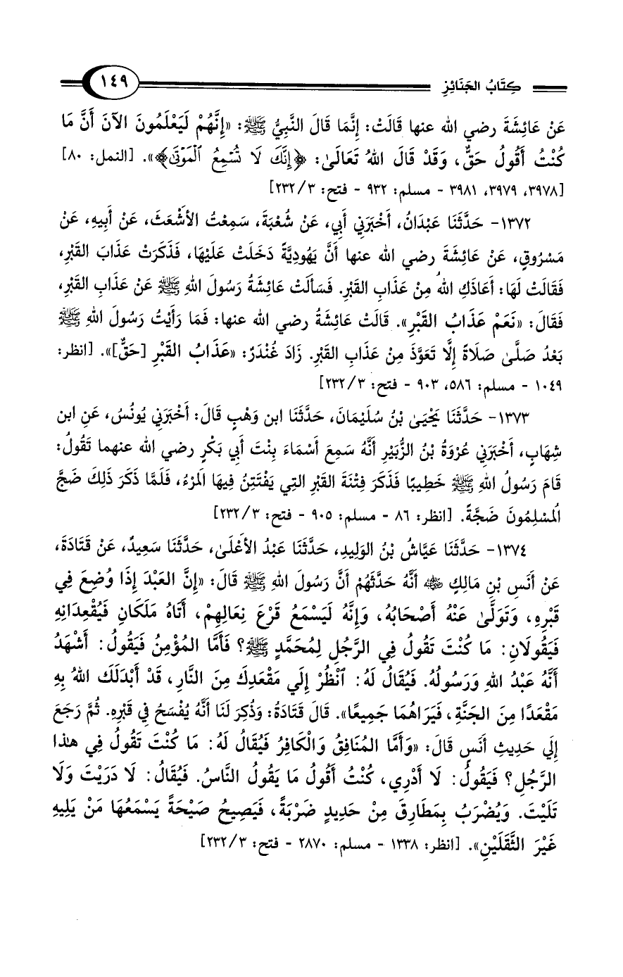 1374 - حَدَّثَنَا عَيَّاشُ بْنُ الوَلِيدِ، حَدَّثَنَا عَبْدُ الأَعْلَى، حَدَّثَنَا سَعِيدٌ، عَنْ قَتَادَةَ، عَنْ أَنَسِ بْنِ مَالِكٍ - رضي الله عنه - أَنَّهُ حَدَّثَهُمْ أَنَّ رَسُولَ اللهِ - صلى الله عليه وسلم - قَالَ: "إِنَّ العَبْدَ إِذَا وُضِعَ فِي قَبْرِهِ، وَتَوَلَّى عَنْهُ أَصْحَابُهُ، وَإِنَّهُ لَيَسْمَعُ قَرْعَ نِعَالِهِمْ، أَتَاهُ مَلَكَانِ فَيُقْعِدَانِهِ فَيَقُولاَنِ: مَا كُنْتَ تَقُولُ فِي الرَّجُلِ لِمُحَمَّدٍ - صلى الله عليه وسلم -؟ فَأَمَّا المُؤْمِنُ فَيَقُولُ: أَشْهَدُ أَنَّهُ عَبْدُ اللهِ وَرَسُولُهُ. فَيُقَالُ لَهُ: انْظُرْ إِلَى مَقْعَدِكَ مِنَ النَّارِ، قَدْ أَبْدَلَكَ اللهُ بِهِ مَقْعَدًا مِنَ الجَنَّةِ، فَيَرَاهُمَا جَمِيعًا". قَالَ قَتَادَةُ: وَذُكِرَ لَنَا أَنَّهُ يُفْسَحُ فِي قَبْرِهِ. ثُمَّ رَجَعَ إِلَي حَدِيثِ أَنَسٍ قَالَ: "وَأَمَّا المُنَافِقُ وَالكَافِرُ فَيُقَالُ لَهُ: مَا كُنْتَ تَقُولُ فِي هَذَا الرَّجُلِ فَيَقُولُ: لاَ أَدْرِى، كُنْتُ أَقُولُ مَا يَقُولُ النَّاسُ. فَيُقَالُ: لاَ دَرَيْتَ وَلاَ تَلَيْتَ. وَيُضْرَبُ بِمَطَارِقَ مِنْ حَدِيدٍ ضَرْبَةً، فَيَصِيحُ صَيْحَةً يَسْمَعُهَا مَنْ يَلِيهِ، غَيْرَ الثَّقَلَيْنِ". [انظر: 1338 - مسلم: 2870 - فتح: 3/ 232]