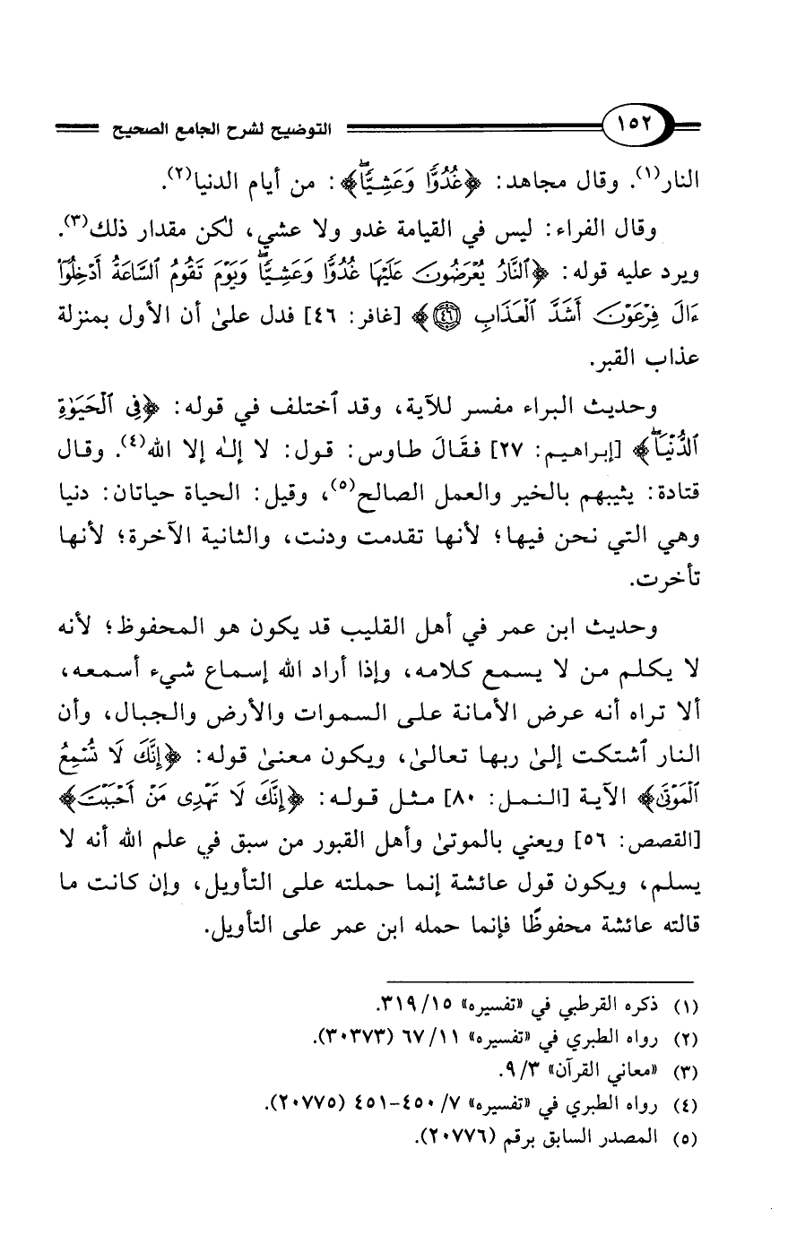 وحديث ابن عمر في أهل القليب قد يكون هو المحفوظ؛ لأنه لا يكلم من لا يسمع كلامه، وإذا أراد الله إسماع شيء أسمعه، ألا تراه أنه عرض الأمانة على السموات والأرض والجبال، وأن النار اشتكت إلى ربها تعالى، ويكون معنى قوله: {لَا تُسْمِعُ المَوْتَى} الآية [النمل: 80] مثل قوله: {إِنَّكَ لَا تَهْدِي مَنْ أَحْبَبْتَ} [القصص: 56] ويعني بالموتى وأهل القبور من سبق فرب علم الله أنه لا يسلم، ويكون قول عائشة إنما حملته على التأويل، وإن كانت ما قالته عائشة محفوظًا فإنما حمله ابن عمر على التأويل.