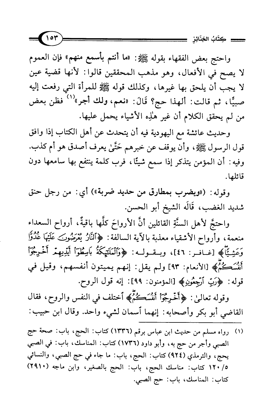 واحتجَّ لأهل السنَّةِ القائلين أنَّ الأرواحَ كلَّها باقيةٌ، أرواح السعداء منعمة، وأرواح الأشقياء معذبة بالآية السالفة: {النَّارُ يُعْرَضُونَ عَلَيْهَا غُدُوًّا وَعَشِيًّا} [غافر: 46]، وبقوله: {وَالمَلَائِكَةُ بَاسِطُو أَيْدِيهِمْ أَخْرِجُوا أَنْفُسَكُمُ} [الأنعام: 93] ولم يقل: إنهم يميتون أنفسهم، وقيل في قوله: {رَبِّ ارْجِعُونِ} [المؤمنون: 99]: إنه قول الروح.