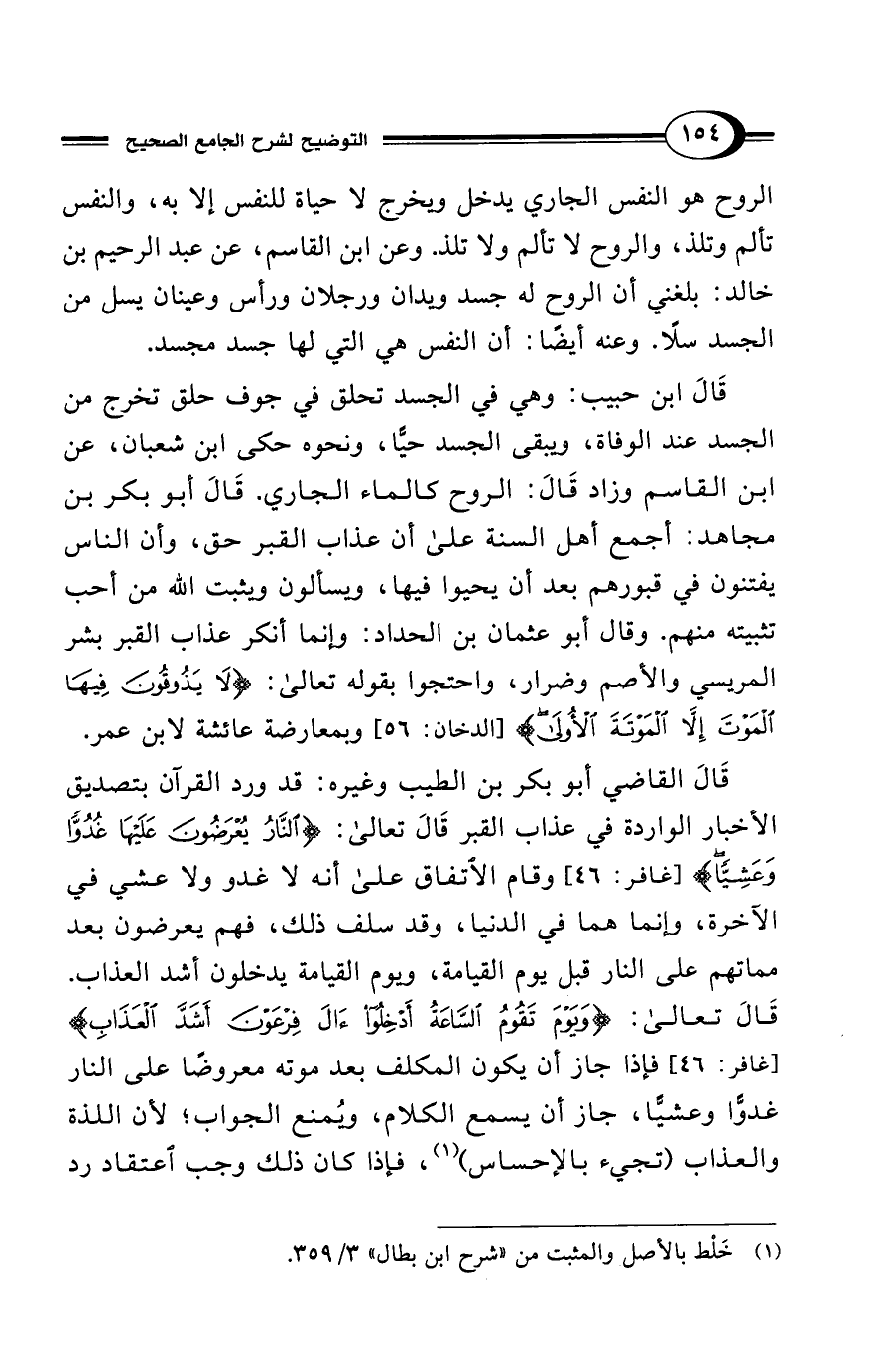 قَالَ القاضي أبو بكر بن الطيب وغيره: قد ورد القرآن بتصديق الأخبار الواردة في عذاب القبر قَالَ تعالى: {النَّارُ يُعْرَضُونَ عَلَيْهَا غُدُوًّا وَعَشِيًّا} [غافر: 46] وقام الاتفاق على أنه لا غدو ولا عشي في الآخرة، وإنما هما في الدنيا، وقد سلف ذلك، فهم يعرضون بعد مماتهم على النار قبل يوم القيامة، ويوم القيامة يدخلون أشد العذاب. قَالَ تعالى: {وَيَوْمَ تَقُومُ السَّاعَةُ أَدْخِلُوا آلَ فِرْعَوْنَ أَشَدَّ العَذَابِ} [غافر: 46] فإذا جاز أن يكون المكلف بعد موته معروضًا على النار غدوًّا وعشيًّا، جاز أن يسمع الكلام، ويُمنع الجواب؛ لأن اللذة والعذاب (تجيء بالإحساس) (¬1)، فإذا كان ذلك وجب اعتقاد رد
