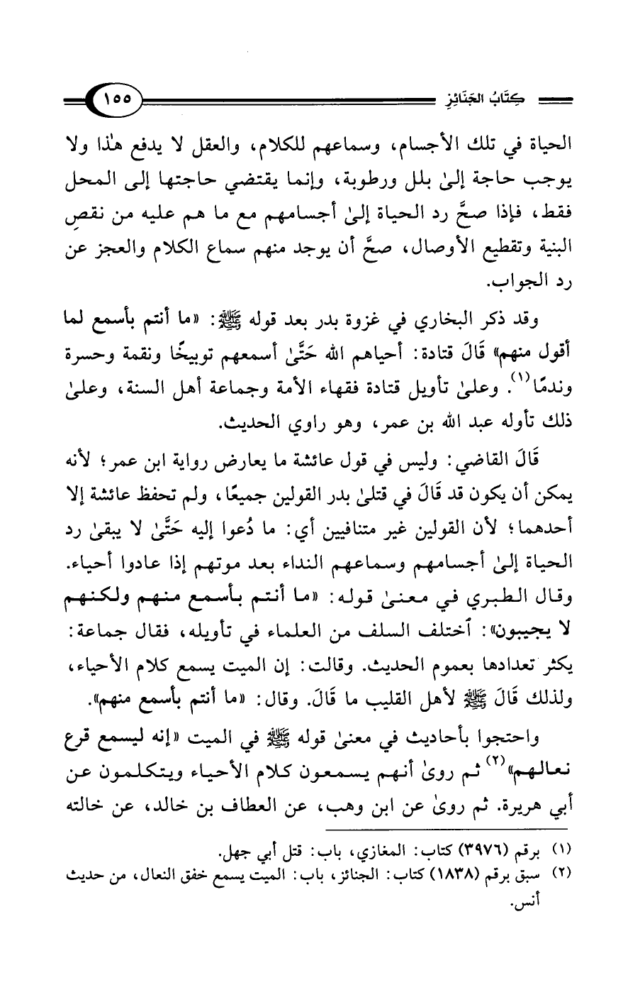 واحتجوا بأحاديث في معنى قوله - صلى الله عليه وسلم - في الميت "إنه ليسمع قرع نعالهم" (¬2) ثم روى أنهم يسمعون كلام الأحياء ويتكلمون عن أبي هريرة. ثم روى عن ابن وهب، عن العطاف بن خالد، عن خالته