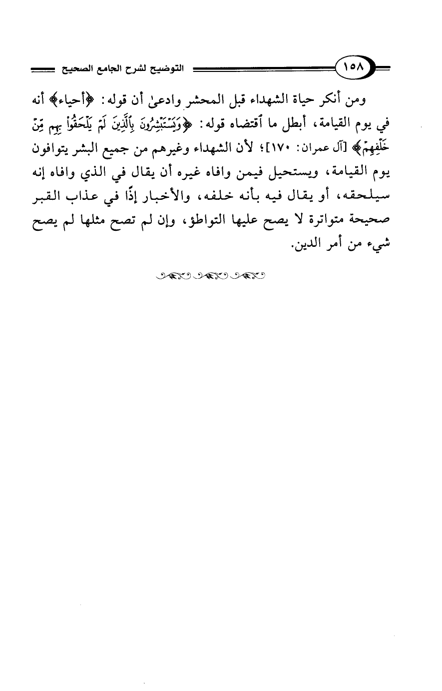 ومن أنكر حياة الشهداء قبل المحشر وادعى أن قوله: {أَحْيَاءٌ} أنه في يوم القيامة، أبطل ما اقتضاه قوله: {وَيَسْتَبْشِرُونَ بِالَّذِينَ لَمْ يَلْحَقُوا بِهِمْ مِنْ خَلْفِهِمْ} [آل عمران: 170]؛ لأن الشهداء وغيرهم من جميع البشر يتوافون يوم القيامة، ويستحيل فيمن وافاه غيره أن يقال في الذي وافاه إنه سيلحقه، أو يقال فيه بأنه خلفه، والأخبار إذًا في عذاب القبر صحيحة متواترة لا يصح عليها التواطؤ، وإن لم تصح مثلها لم يصح شيء من أمر الدين.