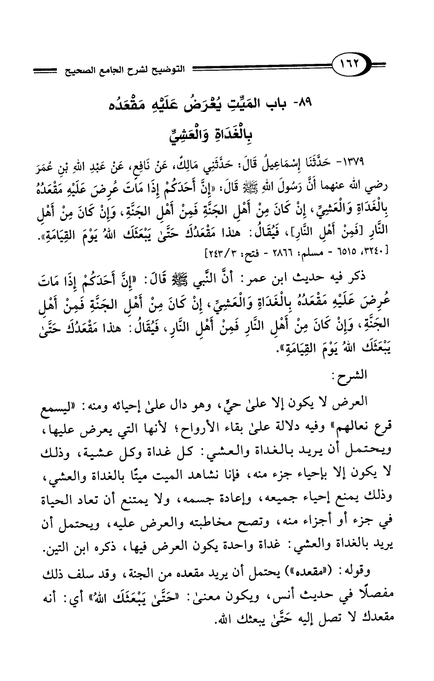 1379 - حَدَّثَنَا إِسْمَاعِيلُ قَالَ: حَدَّثَنِي مَالِكٌ، عَنْ نَافِعٍ، عَنْ عَبْدِ اللهِ بْنِ عُمَرَ رضي الله عنهما أَنَّ رَسُولَ اللهِ - صلى الله عليه وسلم - قَالَ: "إِنَّ أَحَدَكُمْ إِذَا مَاتَ عُرِضَ عَلَيْهِ مَقْعَدُهُ بِالغَدَاةِ وَالعَشِيِّ، إِنْ كَانَ مِنْ أَهْلِ الجَنَّةِ فَمِنْ أَهْلِ الجَنَّةِ، وَإِنْ كَانَ مِنْ أَهْلِ النَّارِ [فَمِنْ أَهْلِ النَّار]، فَيُقَالُ: هَذَا مَقْعَدُكَ حَتَّى يَبْعَثَكَ اللهُ يَوْمَ القِيَامَةِ". [3240، 6515 - مسلم: 2866 - فتح: 3/ 243]