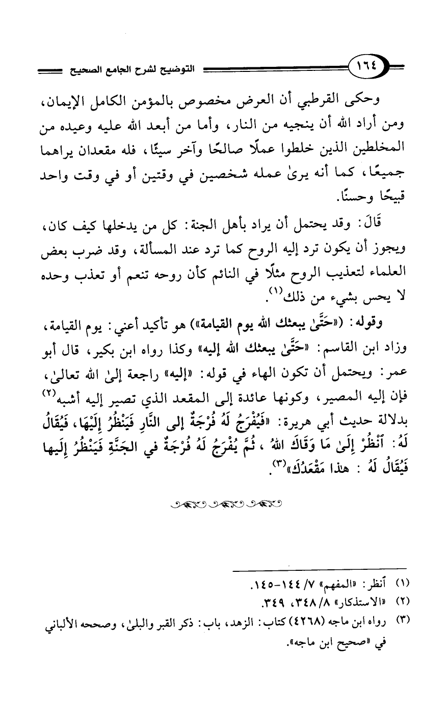 قَالَ: وقد يحتمل أن يراد بأهل الجنة: كل من يدخلها كيف كان، ويجوز أن يكون ترد إليه الروح كما ترد عند المسألة، وقد ضرب بعض العلماء لتعذيب الروح مثلًا في النائم كأن روحه تنعم أو تعذب وحده لايحس بشيء من ذلك (¬1).