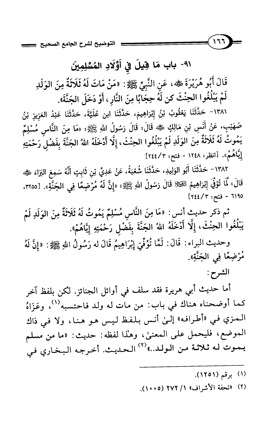 1381 - حَدَّثَنَا يَعْقُوبُ بْنُ إِبْرَاهِيمَ، حَدَّثَنَا ابْنُ عُلَيَّةَ، حَدَّثَنَا عَبْدُ العَزِيزِ بْنُ صُهَيْبٍ، عَنْ أَنَسِ بْنِ مَالِكٍ - رضي الله عنه - قَالَ: قَالَ رَسُولُ اللهِ - صلى الله عليه وسلم -: "مَا مِنَ النَّاسِ مُسْلِمٌ يَمُوتُ لَهُ ثَلاَثَةٌ مِنَ الوَلَدِ لَمْ يَبْلُغُوا الحِنْثَ، إِلاَّ أَدْخَلَهُ اللهُ الجَنَّةَ بِفَضْلِ رَحْمَتِهِ إِيَّاهُمْ". [انظر: 1248 - فتح: 3/ 244]