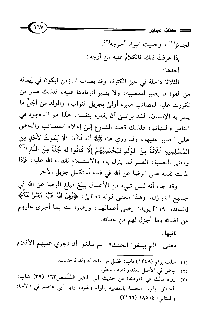 (¬3) رواه مالك في "موطئه" من حديث أبي النضر السَّلَميص 162 (39) كتاب: الجنائز، باب: الحسبة بالمصيبة بالولد وغيره، وابن أبي عاصم في "الآحاد والمثاني" 4/ 185 (2166).