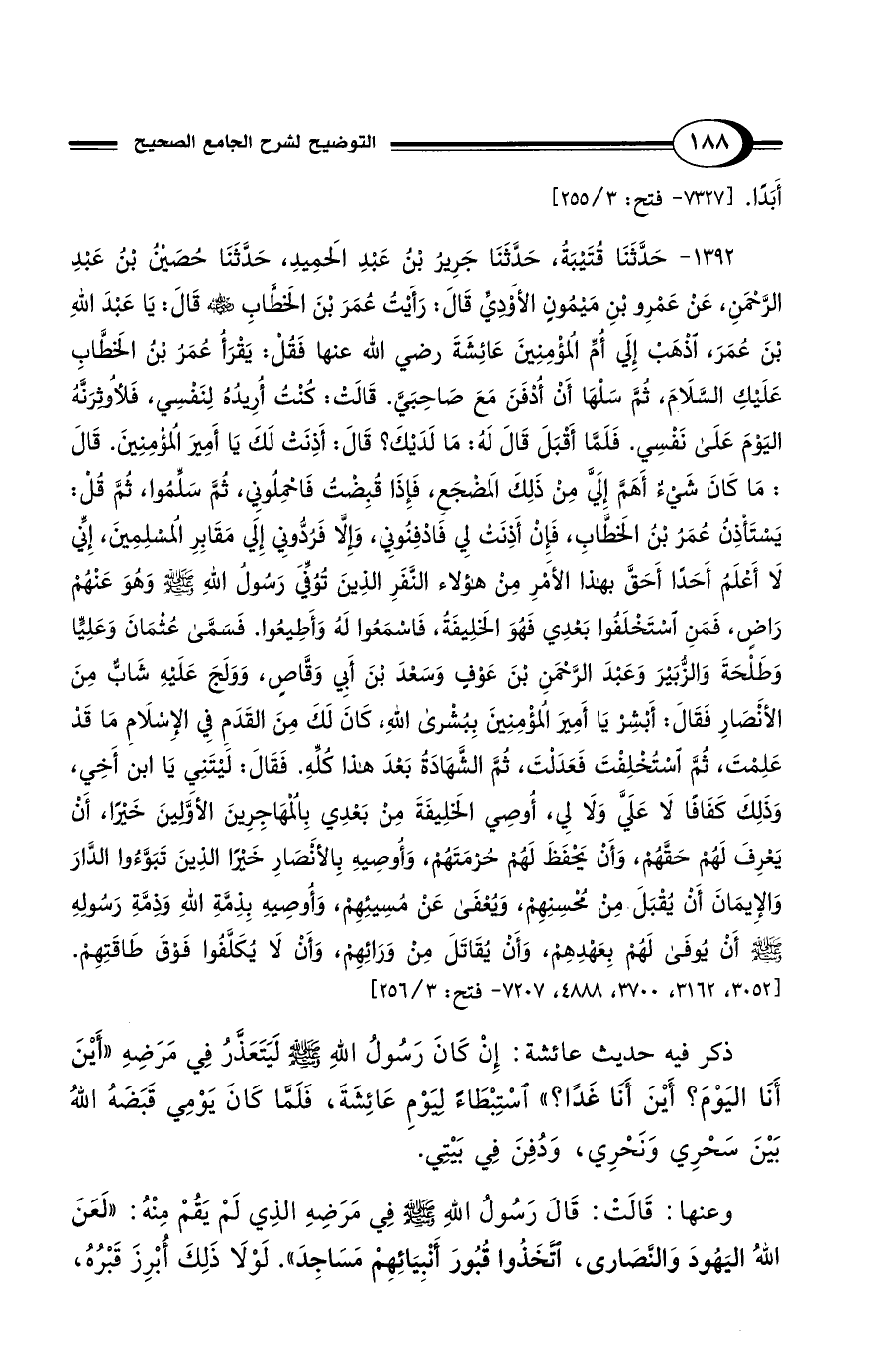 1392 - حَدَّثَنَا قُتَيْبَةُ، حَدَّثَنَا جَرِيرُ بْنُ عَبْدِ الحَمِيدِ، حَدَّثَنَا حُصَيْنُ بْنُ عَبْدِ الرَّحْمَنِ، عَنْ عَمْرِو بْنِ مَيْمُونٍ الأَوْدِيِّ قَالَ: رَأَيْتُ عُمَرَ بْنَ الخَطَّابِ - رضي الله عنه - قَالَ: يَا عَبْدَ اللهِ بْنَ عُمَرَ، اذْهَبْ إِلَي أُمِّ المُؤْمِنِينَ عَائِشَةَ رضي الله عنها فَقُلْ: يَقْرَأُ عُمَرُ بْنُ الخَطَّابِ عَلَيْكِ السَّلاَمَ، ثُمَّ سَلْهَا أَنْ أُدْفَنَ مَعَ صَاحِبَيَّ. قَالَتْ: كُنْتُ أُرِيدُهُ لِنَفْسِي، فَلأُوثِرَنَّهُ اليَوْمَ عَلَى نَفْسِي. فَلَمَّا أَقْبَلَ قَالَ لَهُ: مَا لَدَيْكَ؟ قَالَ: أَذِنَتْ لَكَ يَا أَمِيرَ المُؤْمِنِينَ. قَالَ مَا: كَانَ شَيْءٌ أَهَمَّ إِلَيَّ مِنْ ذَلِكَ المَضْجَعِ، فَإِذَا قُبِضْتُ فَاحْمِلُونِي، ثُمَّ سَلِّمُوا ثُمَّ قُلْ: يَسْتَأْذِنُ عُمَرُ بْنُ الخَطَّابِ. فَإِنْ أَذِنَتْ لِي فَادْفِنُونِي، وَإِلاَّ فَرُدُّونِي إِلَي مَقَابِرِ المُسْلِمِينَ، إِنِّي لاَ أَعْلَمُ أَحَدًا أَحَقَّ بِهَذَا الأَمْرِ مِنْ هَؤُلاَءِ النَّفَرِ الَّذِينَ تُوُفِّيَ رَسُولُ اللهِ - صلى الله عليه وسلم - وَهُوَ عَنْهُمْ رَاضٍ، فَمَنِ اسْتَخْلَفُوا بَعْدِي فَهُوَ الخَلِيفَةُ، فَاسْمَعُوا لَهُ وَأَطِيعُوا. فَسَمَّى عُثْمَانَ وَعَلِيًّا وَطَلْحَةَ وَالزُّبَيْرَ وَعَبْدَ الرَّحْمَنِ بْنَ عَوْفٍ وَسَعْدَ بْنَ أَبِي وَقَّاصٍ، وَوَلَجَ عَلَيْهِ شَابٌّ مِنَ الأَنْصَارِ فَقَالَ: أَبْشِرْ يَا أَمِيرَ المُؤْمِنِينَ بِبُشْرَى اللهِ، كَانَ لَكَ مِنَ القَدَمِ فِي الإِسْلاَمِ مَا قَدْ عَلِمْتَ، ثُمَّ اسْتُخْلِفْتَ فَعَدَلْتَ، ثُمَّ الشَّهَادَةُ بَعْدَ هَذَا كُلِّهِ. فَقَالَ: لَيْتَنِي يَا ابْنَ أَخِي، وَذَلِكَ كَفَافًا لاَ عَلَيَّ وَلاَ لِي، أُوصِي الخَلِيفَةَ مِنْ بَعْدِي بِالمُهَاجِرِينَ الأَوَّلِينَ خَيْرًا، أَنْ يَعْرِفَ لَهُمْ حَقَّهُمْ، وَأَنْ يَحْفَظَ لَهُمْ حُرْمَتَهُمْ، وَأُوصِيهِ بِالأَنْصَارِ خَيْرًا الذِينَ تَبَوَّءُوا الدَّارَ وَالإِيمَانَ أَنْ يُقْبَلَ مِنْ مُحْسِنِهِمْ، وَيُعْفَى عَنْ مُسِيئِهِمْ، وَأُوصِيهِ بِذِمَّةِ اللهِ وَذِمَّةِ رَسُولِهِ - صلى الله عليه وسلم - أَنْ يُوفَى لَهُمْ بِعَهْدِهِمْ، وَأَنْ يُقَاتَلَ مِنْ وَرَائِهِمْ، وَأَنْ لاَ يُكَلَّفُوا فَوْقَ طَاقَتِهِمْ. [3052، 3162، 3700، 4888، 7207 - فتح: 3/ 256]