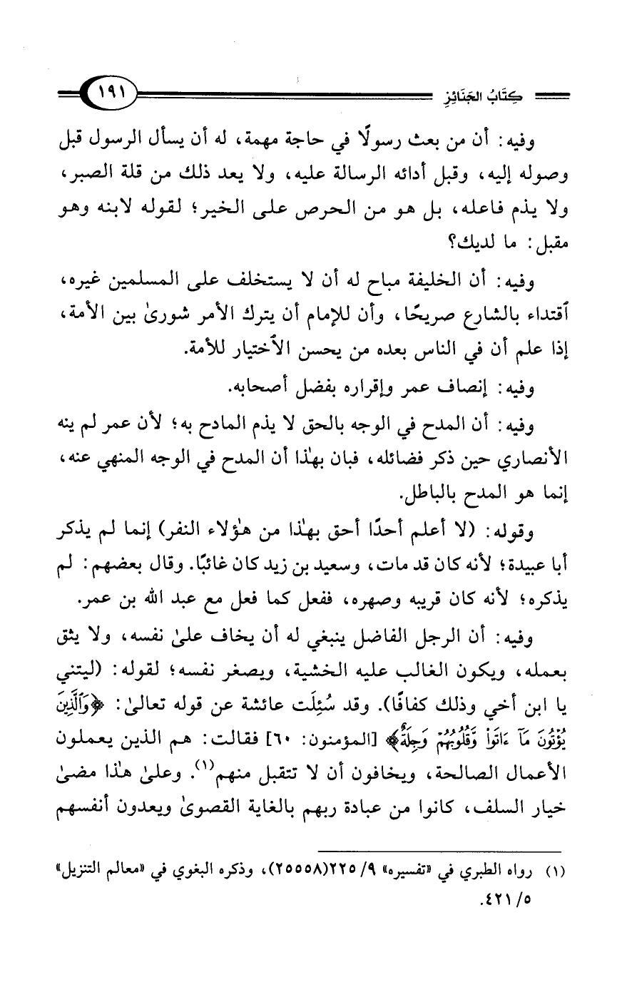 وفيه: أن الرجل الفاضل ينبغي له أن يخاف على نفسه، ولا يثق بعمله، ويكون الغالب عليه الخشية، ويصغر نفسه؛ لقوله: (ليتنى يا ابن أخي وذلك كفافًا) وقد سُئِلَتَ عائشة عن قوله تعالى: {وَالَّذِينَ يُؤْتُونَ مَا آتَوْا وَقُلُوبُهُمْ وَجِلَةٌ} [المؤمنون: 60]، فقالت: هم الذين يعملون الأعمال الصالحة، ويخافون أن لا تتقبل منهم (¬1). وعلى هذا مضى خيار السلف، كانوا من عبادة ربهم بالغاية القصوى ويعدون أنفسهم
