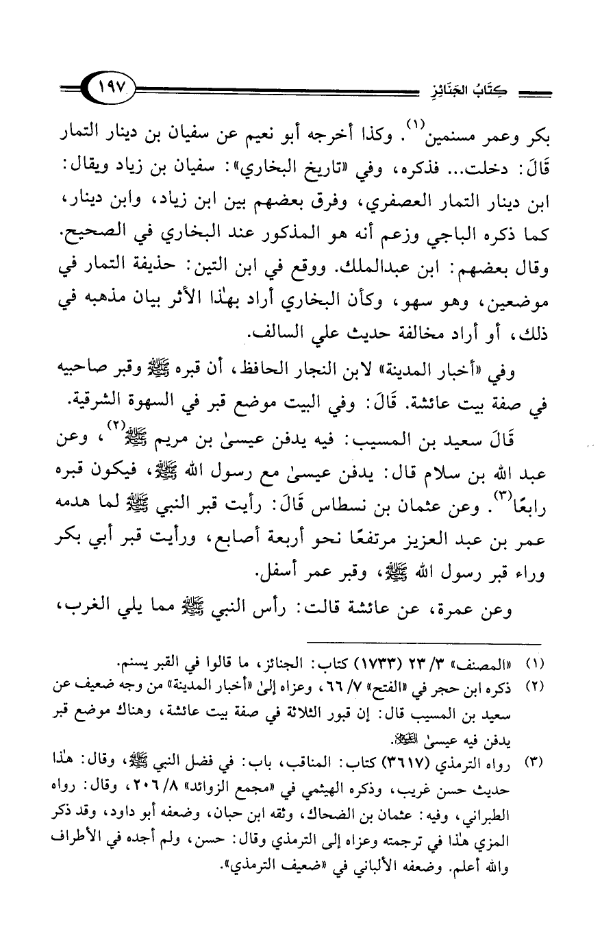 (¬2) ذكره ابن حجر في "الفتح" 7/ 66، وعزاه إلى "أخبار المدينة" من وجه ضعيف عن سعيد بن المسيب قال: إن قبور الثلاثة في صفة بيت عائشة، وهناك موضع قبر يدفن فيه عيسى - عليه السلام -.