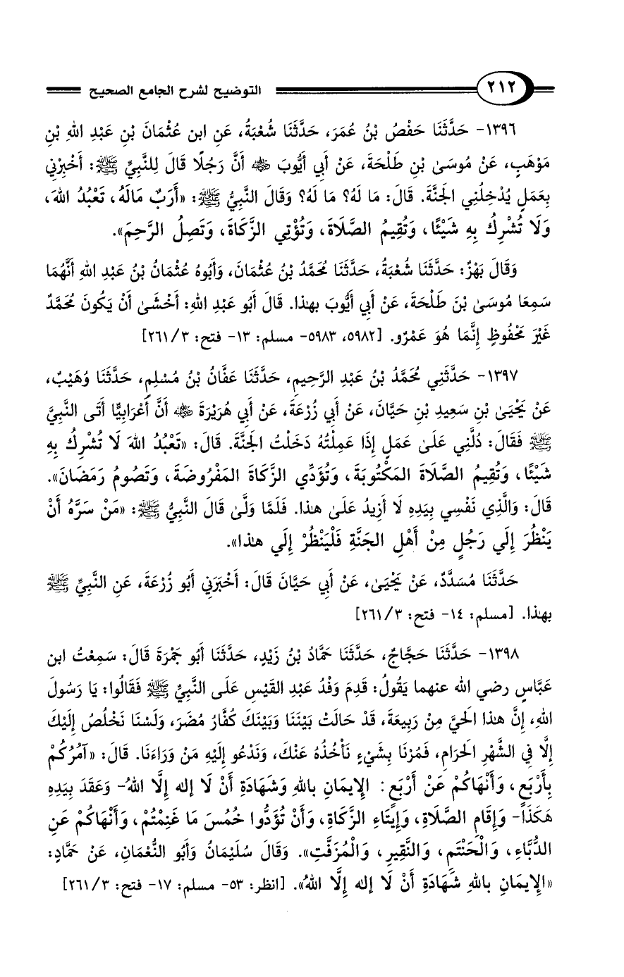 1396 - حَدَّثَنَا حَفْصُ بْنُ عُمَرَ، حَدَّثَنَا شُعْبَةُ، عَنِ ابْنِ عُثْمَانَ بْنِ عَبْدِ اللهِ بْنِ مَوْهَبٍ، عَنْ مُوسَى بْنِ طَلْحَةَ، عَنْ أَبِي أَيُّوبَ رضي الله عنه أَنَّ رَجُلًا قَالَ لِلنَّبِيِّ - صلى الله عليه وسلم -: أَخْبِرْنِي بِعَمَلٍ يُدْخِلُنِي الجَنَّةَ. قَالَ: مَا لَهُ؟ مَا لَهُ؟ وَقَالَ النَّبِيُّ - صلى الله عليه وسلم -: "أَرَبٌ مَالَهُ، تَعْبُدُ اللهَ، وَلاَ تُشْرِكُ بِهِ شَيْئًا، وَتُقِيمُ الصَّلاَةَ، وَتُؤْتِي الزَّكَاةَ، وَتَصِلُ الرَّحِمَ".