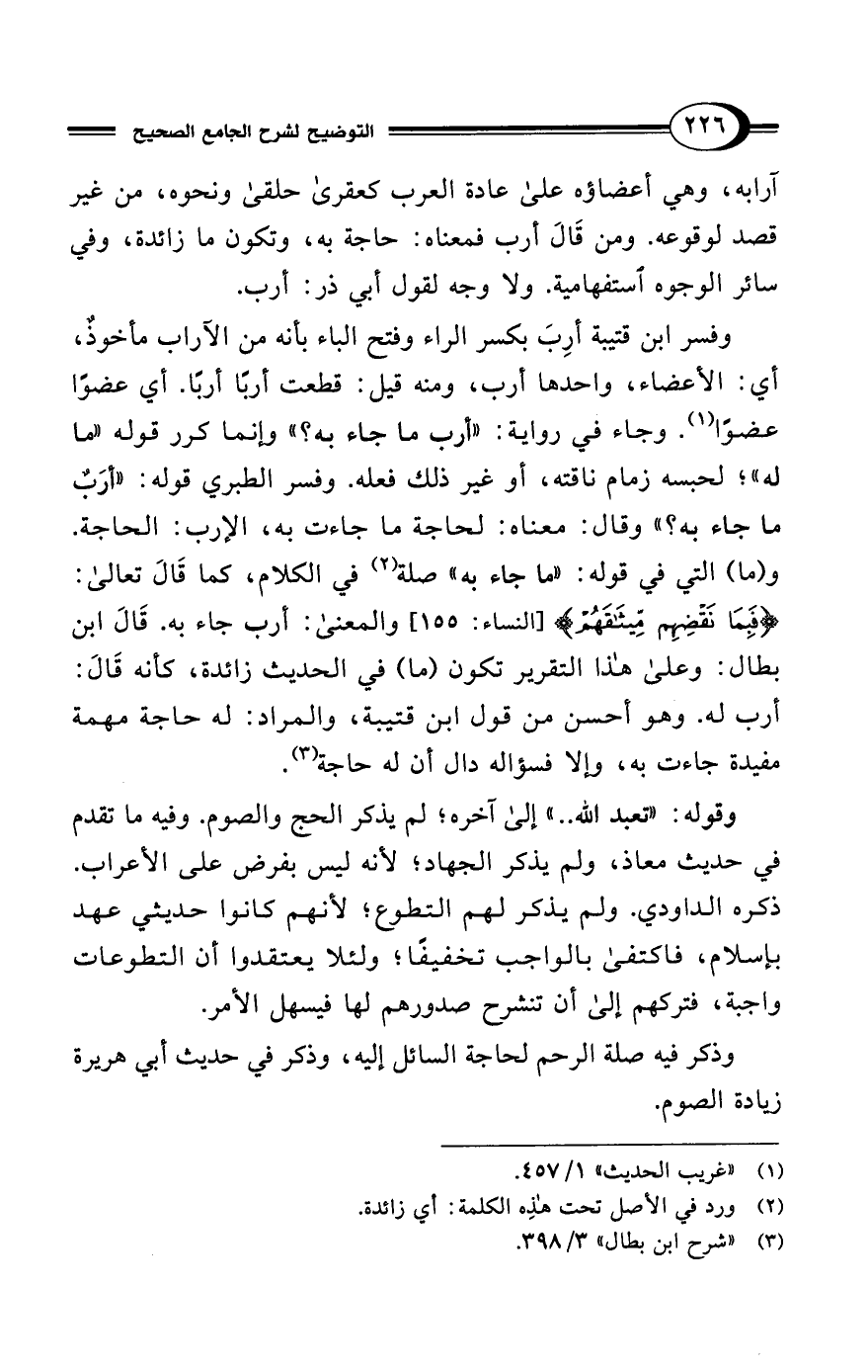 وفسر ابن قتيبة أرِبَ بكسر الراء وفتح الباء بأنه من الآراب مأخوذٌ، أي: الأعضاء، واحدها أرب، ومنه قيل: قطعت أربًا أربًا. أي عضوًا عضوًا (¬1). وجاء في رواية: "أرب ما جاء به؟ " وإنما كرر قوله "ما له"؛ لحبسه زمام ناقته، أو غير ذلك فعله. وفسر الطبري قوله: "أرَبٌ ما جاء به؟ " وقال: معناه: لحاجة ما جاءت به، الإرب: الحاجة. و (ما) التي في قوله: "ما جاء به" صلة (¬2) في الكلام، كما قَالَ تعالى: {فَبِمَا نَقْضِهِمْ مِيثَاقَهُمْ} [النساء: 155] والمعنى: أرب جاء به. قَالَ ابن بطال: وعلى هذا التقرير تكون (ما) في الحديث زائدة، كأنه قَالَ: أرب له. وهو أحسن من قول ابن قتيبة، والمراد: له حاجة مهمة مفيدة جاءت به، وإلا فسؤاله قال أن له حاجة (¬3).