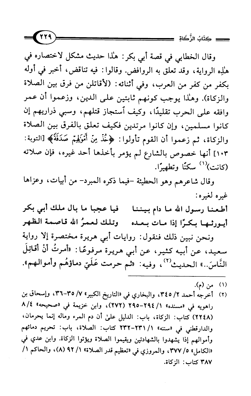وقال الخطابي في قصة أبي بكر: هذا حديث مشكل لاختصاره في هذِه الرواية، وقد تعلق به الروافض. وقالوا: فيه تناقض، أخبر في أوله بكفر من كفر من العرب، وفي أثنائه: (لأقاتلن من فرق بين الصلاة والزكاة). وهذا يوجب كونهم ثابتين على الدين، وزعموا أن عمر وافقه على الحرب تقليدًا، وكيف استجاز قتلهم، وسبي ذراريهم إن كانوا مسلمين، وإن كانوا مرتدين فكيف تعلق بالفرق بين الصلاة والزكاة، ثم زعموا أن القوم تأولوا: {خُذْ مِنْ أَمْوَالِهِمْ صَدَقَةً} [التوبة: 103] أنها خصوص بالشارع لم يؤمر بأخذها أحد غيره، فإن صلاته (كانت) (¬1) سكنًا وتطهيرًا.
