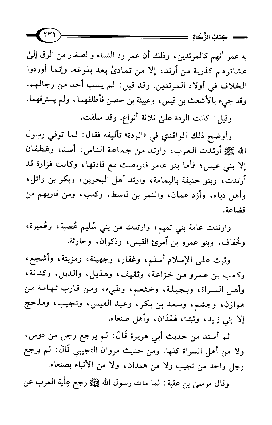 وأوضح ذلك الواقدي في "الردة" تأليفه فقال: لما توفي رسول الله - صلى الله عليه وسلم - ارتدت العرب، وارتد من جماعة الناس: أسد، وغطفان إلا بني عبس؛ فأما بنو عامر فتربصت مع قادتها، وكانت فزارة قد ارتدت، وبنو حنيفة باليمامة، وارتد أهل البحرين، وبكر بن وائل، وأهل دباء، وأزد عمان، والنمر بن قاسط، وكلب، ومن قاربهم من قضاعة.