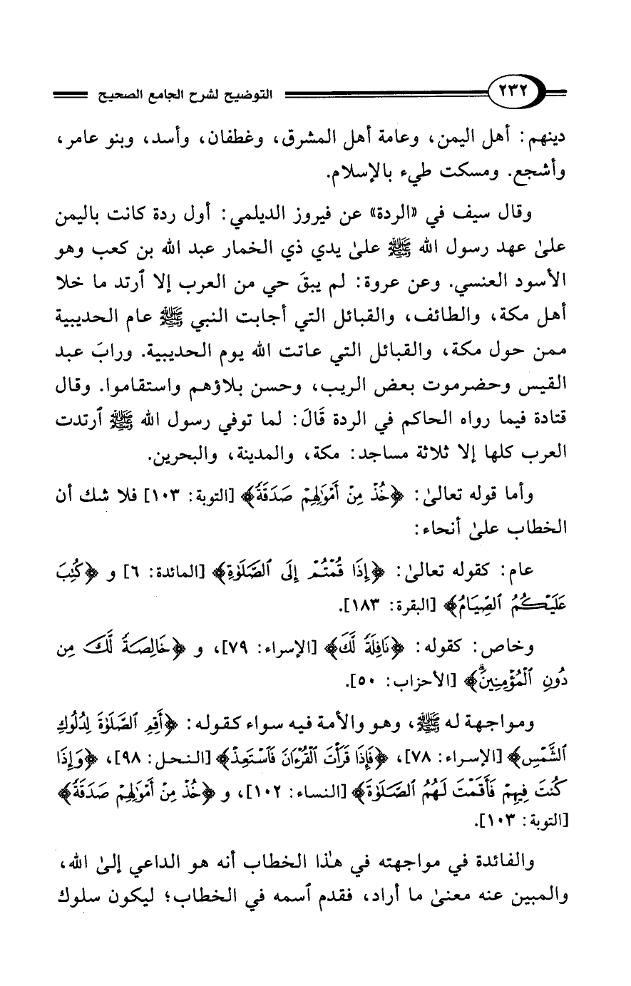 ومواجهة له - صلى الله عليه وسلم -، وهو والأمة فيه سواء كقوله: {أَقِمِ الصَّلَاةَ لِدُلُوكِ الشَّمْسِ} [الإسراء: 78]، {فَإِذَا قَرَأْتَ القُرْآنَ فَاسْتَعِذْ} [النحل: 98]، {وَإِذَا كُنْتَ فِيهِمْ فَأَقَمْتَ لَهُمُ الصَّلَاةَ} [النساء: 102]، و {خُذْ مِنْ أَمْوَالِهِمْ صَدَقَةً} [التو بة: 103].