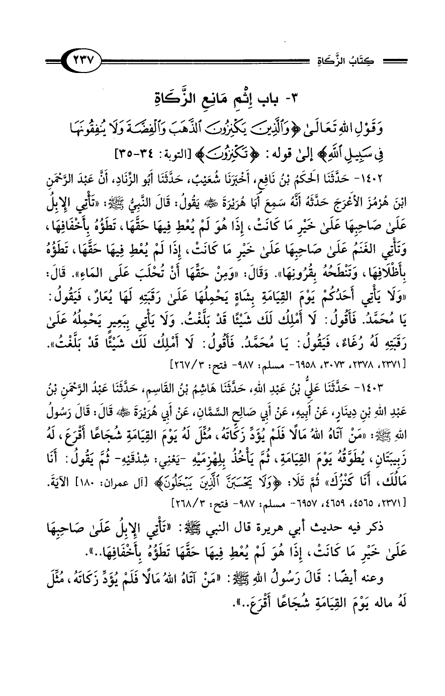 1403 - حَدَّثَنَا عَلِيُّ بْنُ عَبْدِ اللهِ، حَدَّثَنَا هَاشِمُ بْنُ القَاسِمِ، حَدَّثَنَا عَبْدُ الرَّحْمَنِ بْنُ عَبْدِ اللهِ بْنِ دِينَارٍ، عَنْ أَبِيهِ، عَنْ أَبِي صَالِحٍ السَّمَّانِ، عَنْ أَبِي هُرَيْرَةَ - رضي الله عنه - قَالَ: قَالَ رَسُولُ اللهِ - صلى الله عليه وسلم - "مَنْ آتَاهُ اللهُ مَالًا فَلَمْ يُؤَدِّ زَكَاتَهُ، مُثِّلَ لَهُ يَوْمَ القِيَامَةِ شُجَاعًا أَقْرَعَ، لَهُ زَبِيبَتَانِ، يُطَوَّقُهُ يَوْمَ القِيَامَةِ، ثُمَّ يَأْخُذُ بِلِهْزِمَيْهِ -يَعْنِي: شِدْقَيْهِ- ثُمَّ يَقُولُ: أَنَا مَالُكَ، أَنَا كَنْزُكَ" ثُمَّ تَلاَ: {وَلَا يَحْسَبَنَّ الَّذِينَ يَبْخَلُونَ} [آل عمران: 180] الآيَةَ. [2371، 4565، 4659، 6957 - مسلم: 987 - فتح: 3/ 368]