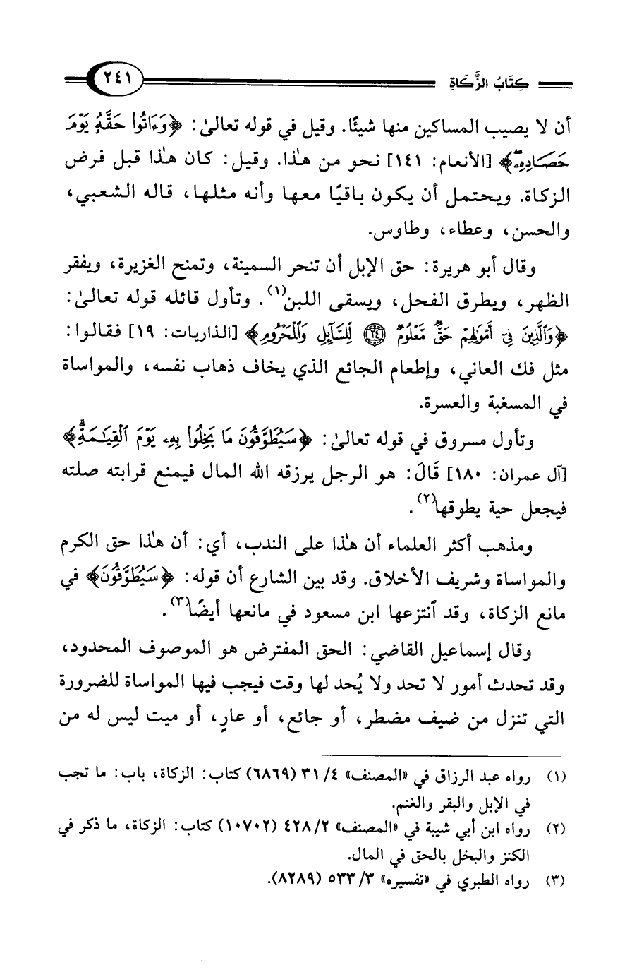 ومذهب أكثر العلماء أن هذا على الندب، أي: أن هذا حق الكرم والمواساة وشريف الأخلاق. وقد بين الشارع أن قوله: {سَيُطَوَّقُونَ} في مانع الزكاة، وقد انتزعها ابن مسعود في مانعها أيضًا (¬3).