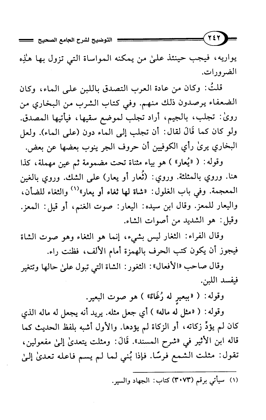 قلتُ: وكان من عادة العرب التصدق باللبن علي الماء، وكان الضعفاء يرصدون ذلك منهم. وفي كتاب الشرب من البخاري من روى: تجلب، بالجيم، أراد تجلب لموضع سقيها، فيأتيها المصدق.